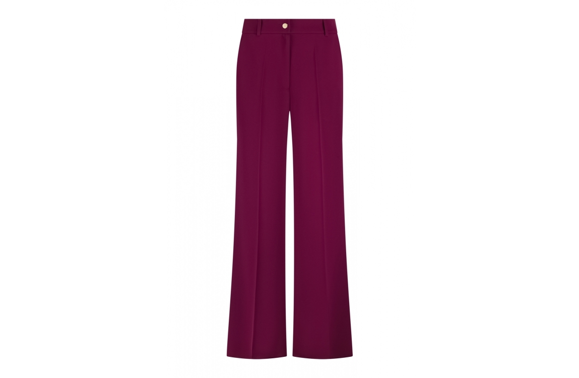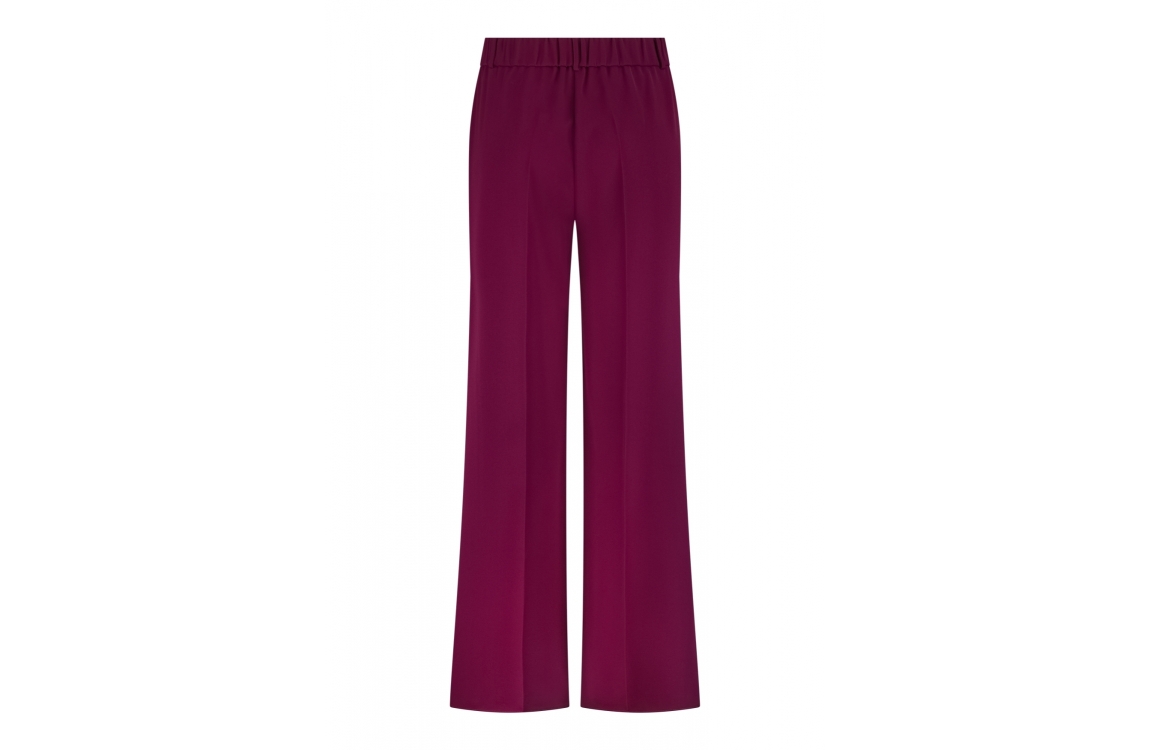 Label Dot pantalon Rana 2528000. Dit wide leg model sluit door middel van een knoop en rits afgewerkt met ceintuurlussen. Deze bordeaux kleurige pantalon van Label Dot is voorzien van twee steekzakken aan de voorzijde en twee paspelzakken aan de achterzijde.