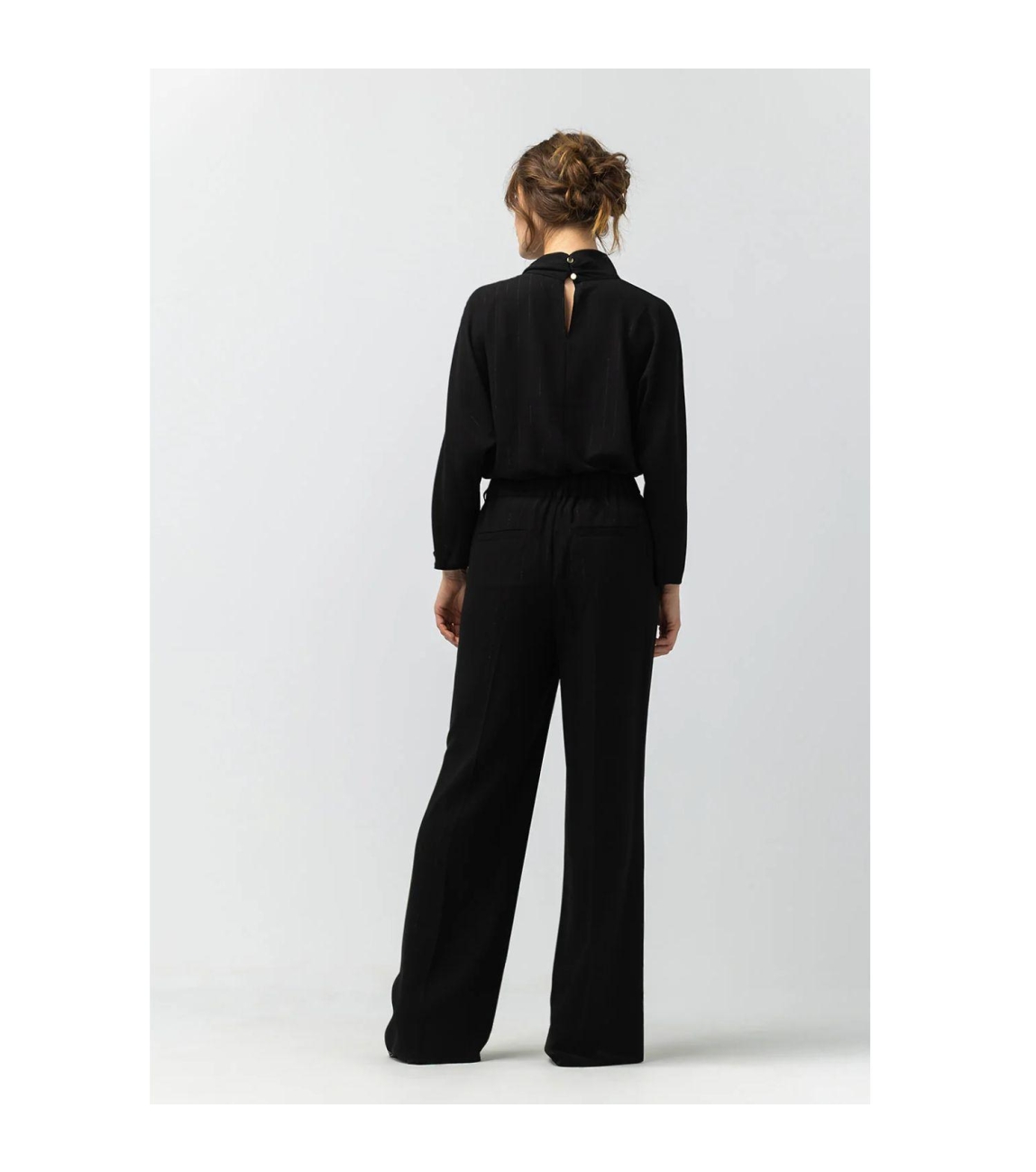 Label Dot Remy 900 zwart. Dit wide leg model sluit door middel van een knoop en rits afgewerkt met ceintuurlussen. Deze zwarte pantalon van Label Dot is voorzien van twee steekzakken aan de voorzijde en twee paspelzakken aan de achterzijde. Dit model is all-over bewerkt met een lurex streeppatroon en heeft een elastische boord aan de achterzijde.