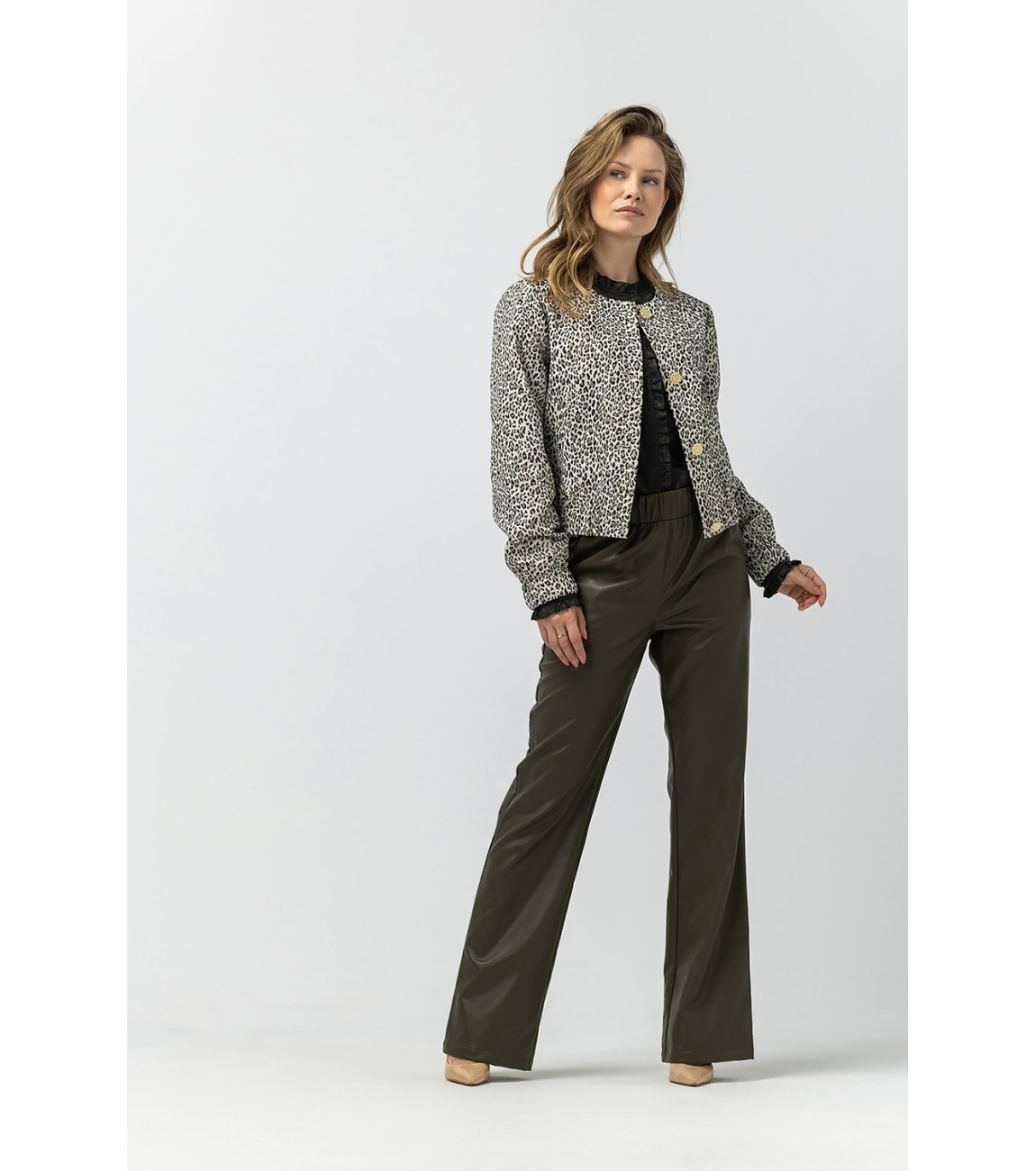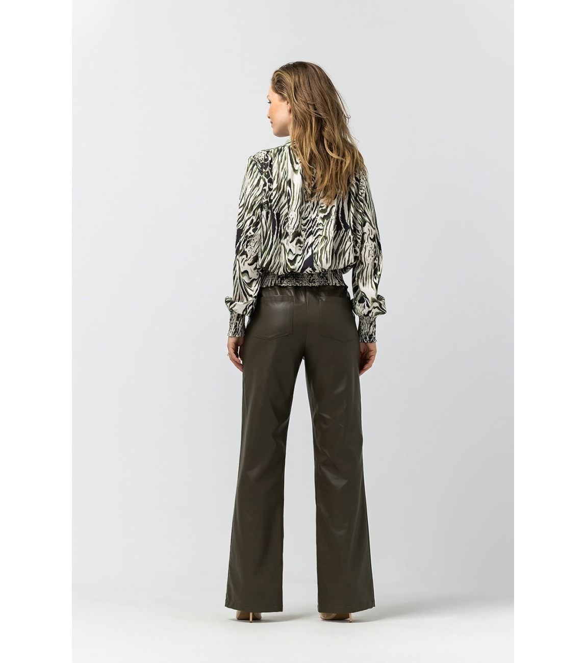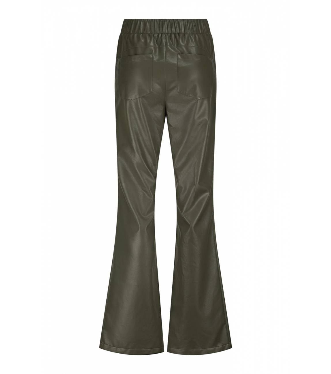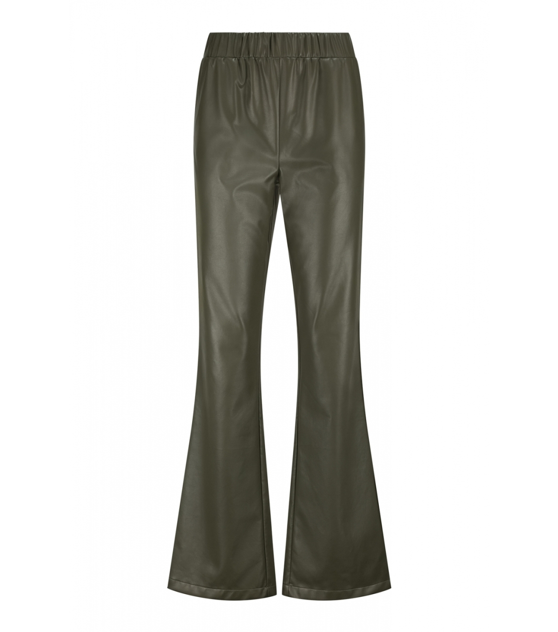 Label Dot broek Rina 2528007. Dit wide leg model sluit door middel van een elastische boord en beschikt over twee steekzakken aan de voor- en achterzijde. Deze khaki kleurige broek van Label Dot is uitgevoerd in een fake leather kwaliteit.