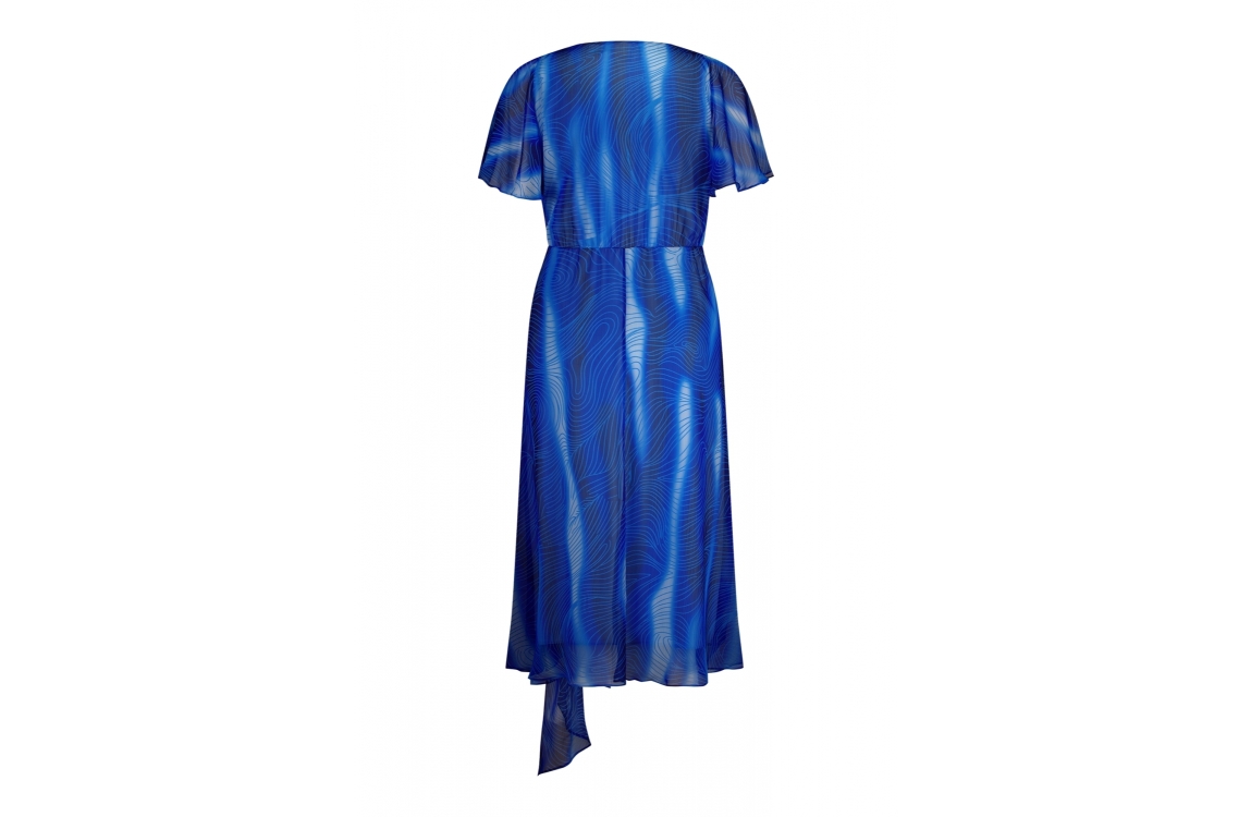 Label Dot jurk Saskia 2513004. Dit rechtvallend model heeft een V-hals en korte vlindermouwen. Deze blauwe jurk van Label Dot is all-over bewerkt met een golvend dessin in blauwinten en beschikt over een vast gestikte overslag met striksluiting aan de zijkant.