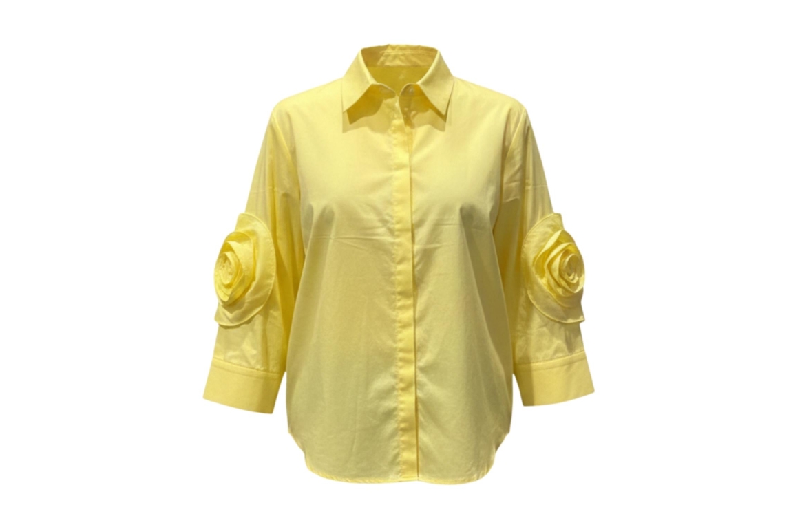 Leo en Ugo blouse L61-JE908. Dit rechtvallende model heeft een kraag en korte mouwen. Deze geelkleurige blouse van Leo en Ugo sluit aan de voorzijde door middel van knoopsluitingen en is op de mouwen gedetailleerd met een bloemdetail.