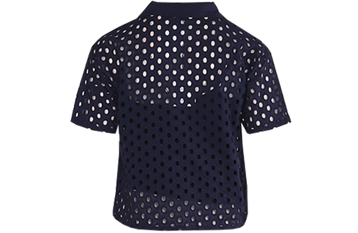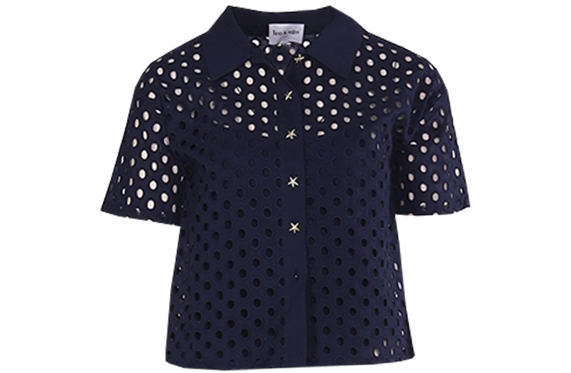 Leo en Ugo blouse JE924. Dit rechtvallend model heeft een kraag, korte mouwen en sluit door middel van gouden sterrenknopen. Deze blauwe blouse van Leo & Ugo is uitgevoerd in een broderie materiaal en beschikt over een hemdje eronder.