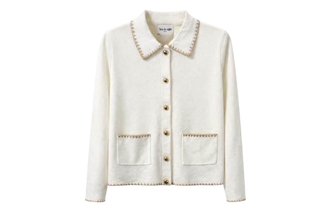 Leo en Ugo jasje AE133. Dit aangesloten model heeft een kraag, lange mouwen en sluit door middel van knopen. Dit witte jasje van Leo & Ugo is bewerkt met gouden details en beschikt over verschillende steekzakken.