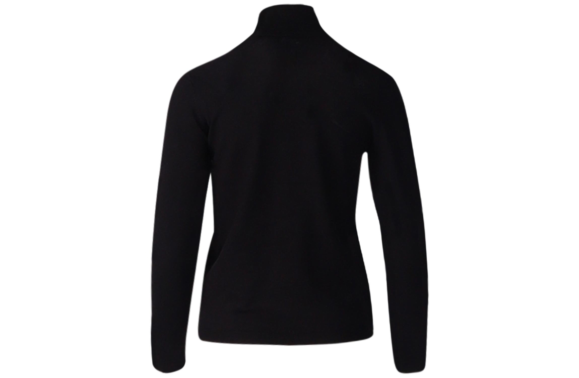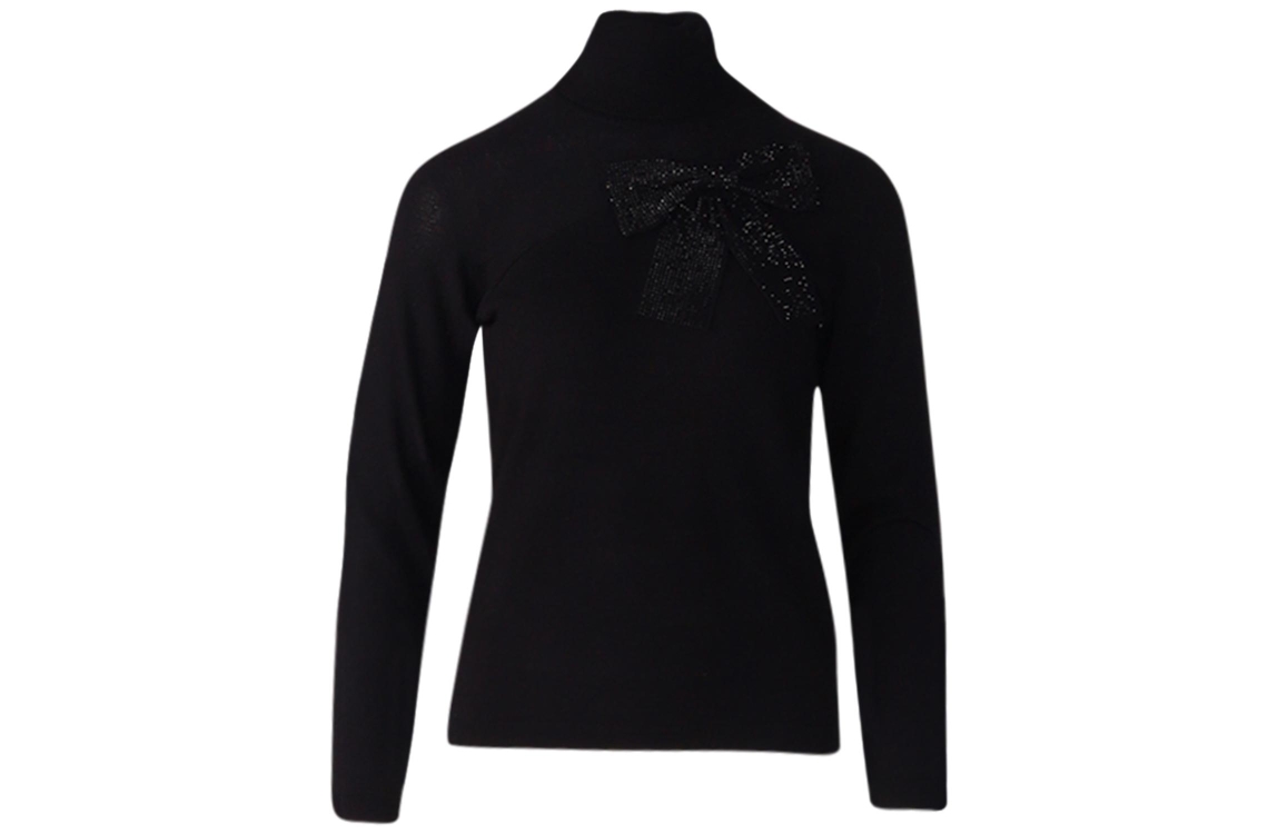 Leo & Ugo top BW300. Dit rechtvallend model is voorzien van een col en heeft lange mouwen. Deze zwarte top van Leo & Ugo is aan de bovenzijde bewerkt in een gaas structuur en is afgewerkt met een strik aan de voorzijde bewerkt met strass steentjes.