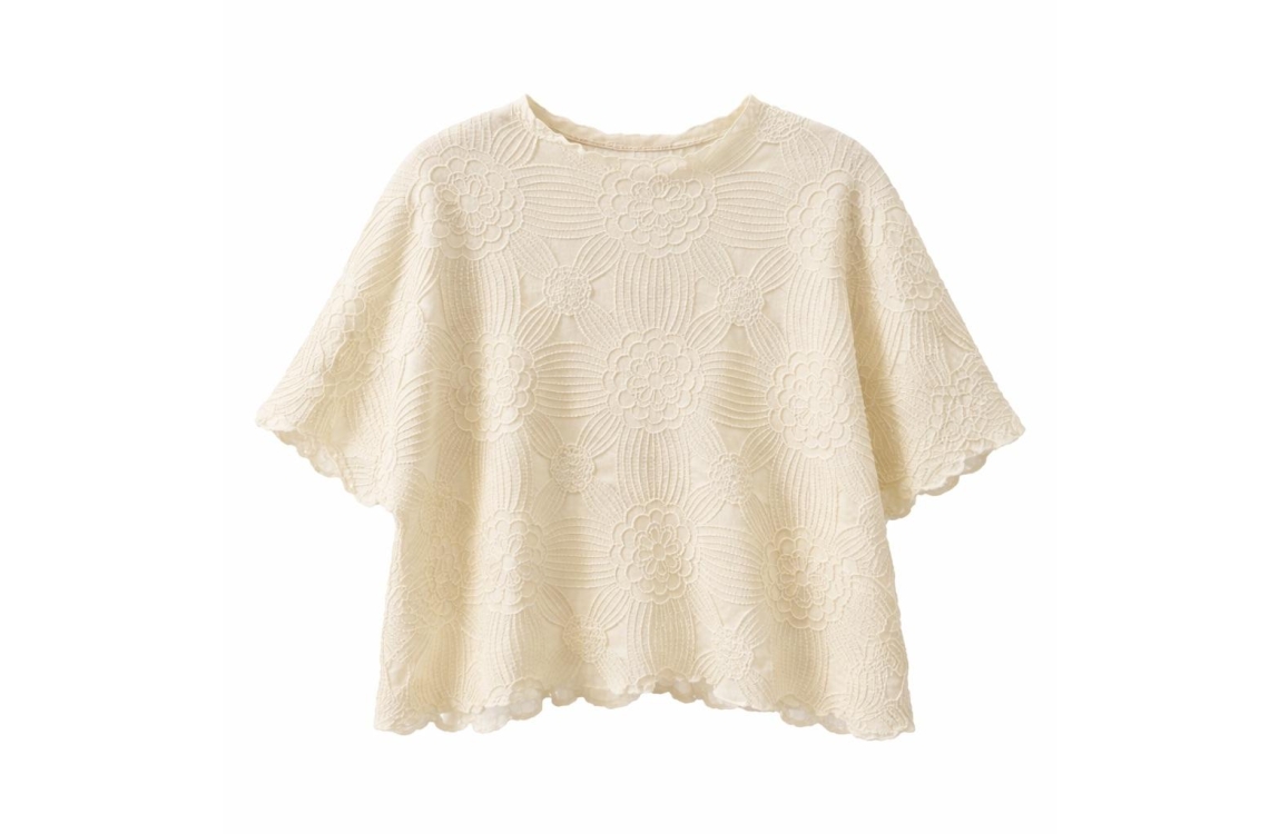 Leo en Ugo top KE303. Dit cropped model heeft een ronde hals en korte mouwen. Deze creme kleurige top van Leo en Ugo en uitgevoerd met een gestikt bloemenmotief en gemaakt van een stretch materiaal.