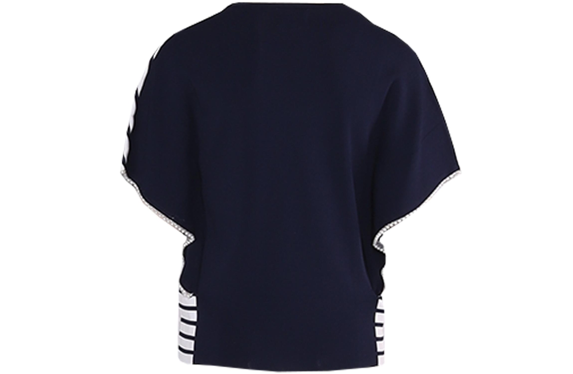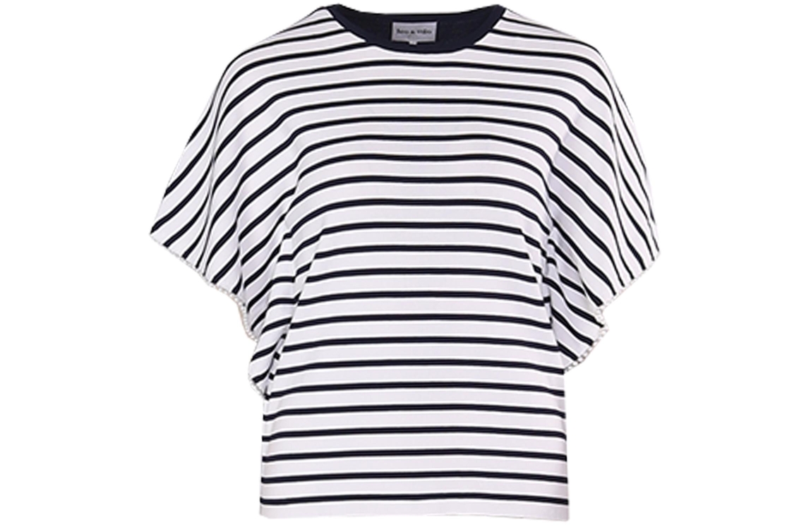 Leo en Ugo top L61-ME400. Dit wijdvallend model heeft een ronde hals en korte vleermuismouwen. Deze blauw/wit gestreepte top van Leo en Ugo is afgewerkt met parels aan de onderzijde van de mouwen en heeft een effen blauwe achterzijde.