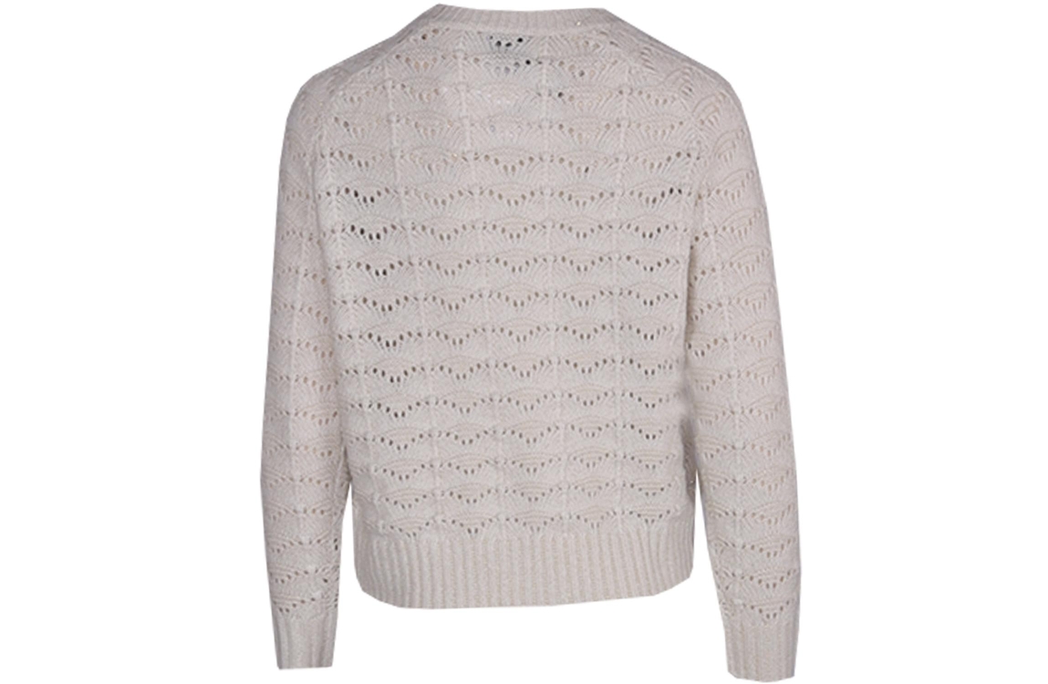 Leo en Ugo top NH164. Dit rechtvallend model heeft een ronde hals en lange mouwen. Deze gebroken witte trui van Leo en Ugo is opengehaakt uitgevoerd en is all-over gedetailleerd met glitter details. Dit model is afgewerkt met gebreide boorden.