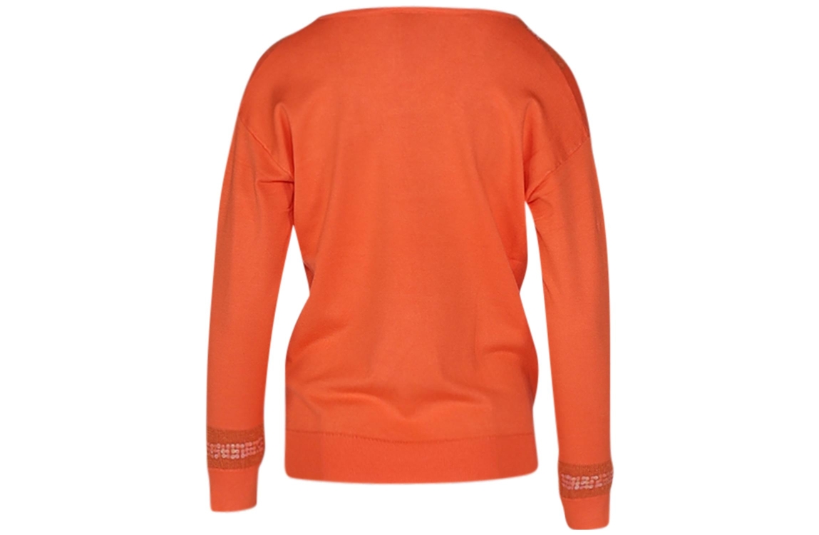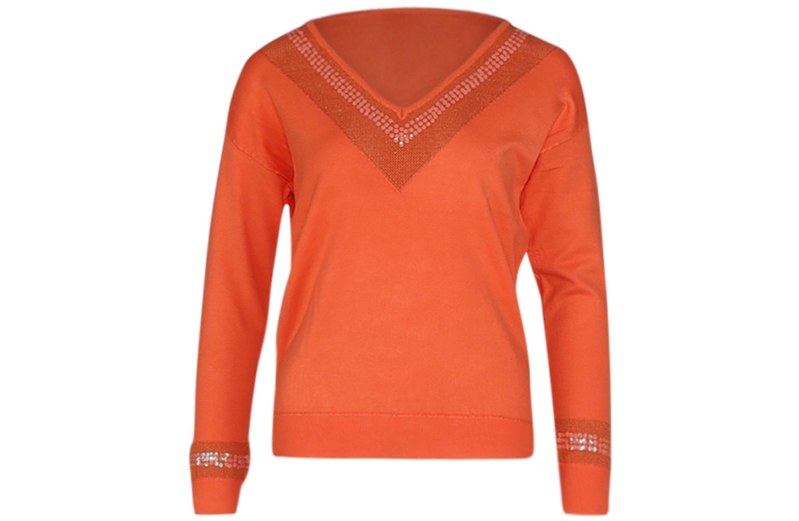 Leo & Ugo top BE214. Dit soepelvallend model heeft een v-hals en lange mouwen. Deze oranje top van Leo & Ugo is voorzien van pailettes en glitter bij de hals en aan de onderzijde van de mouwen. De top heeft subtiele splitjes aan de zijkant.