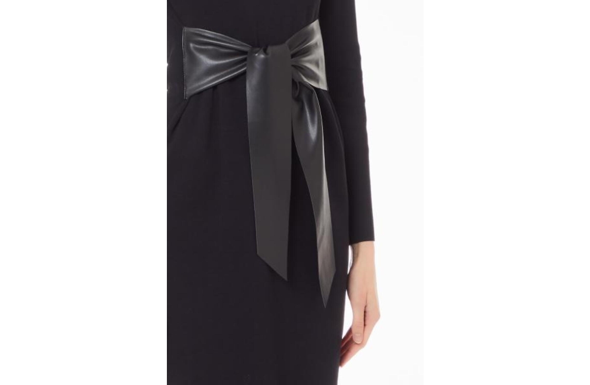 Liu Jo jurk WF4531MA05P22222. Dit licht getailleerd model heeft een brede ronde hals en lange uitlopende mouwen. Deze zwarte jurk van Liu Jo is gedetailleerd met een strikceintuur in een leer-look aan de voorzijde en is afgewerkt met een ribgebreide halsboord.