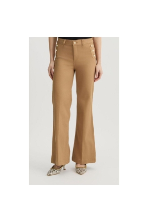 Liu Jo broek WA5459t403371320. Dit flared model sluit door middel van een knoop en rits afgewerkt met ceintuurlussen. Deze bruine broek van Liu Jo is voorzien van steekzakken en is aan de voorzijde bewerkt met parel knoopdetails.