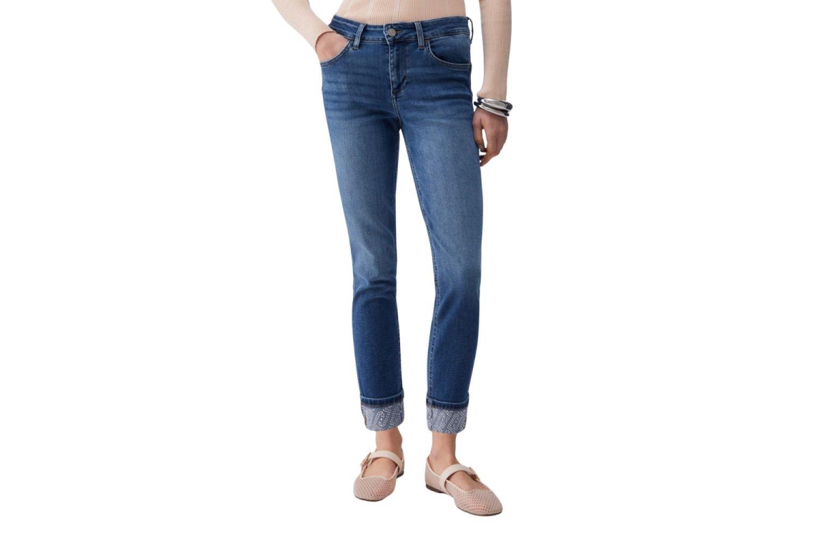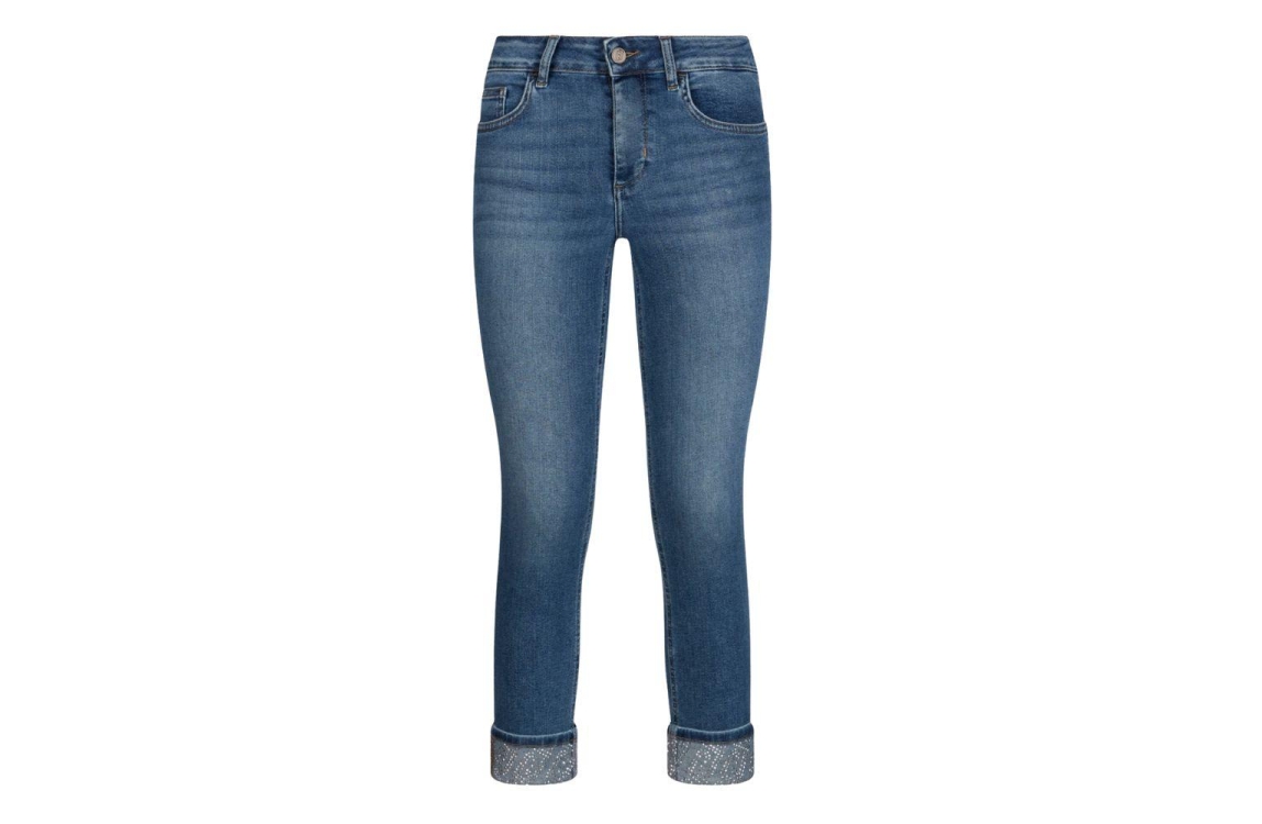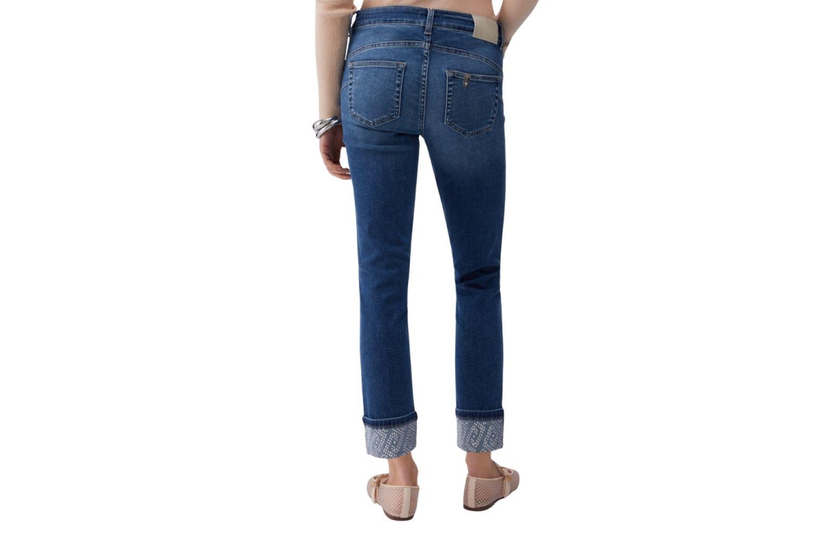 Lio Jo jeans UA6006D0305. Dit skinny leg model sluit door middel van een knoop- en ritssluiting en is voorzien van ceintuurlussen. Deze denim jeans van Liu Jo is uitgevoerd in een 5-pocket model en heeft gedetailleerde broekspijpen met strass-steentjes. Het model is afgewerkt met een patch aan de achterzijde.