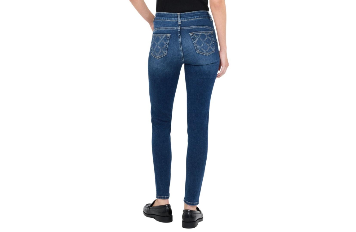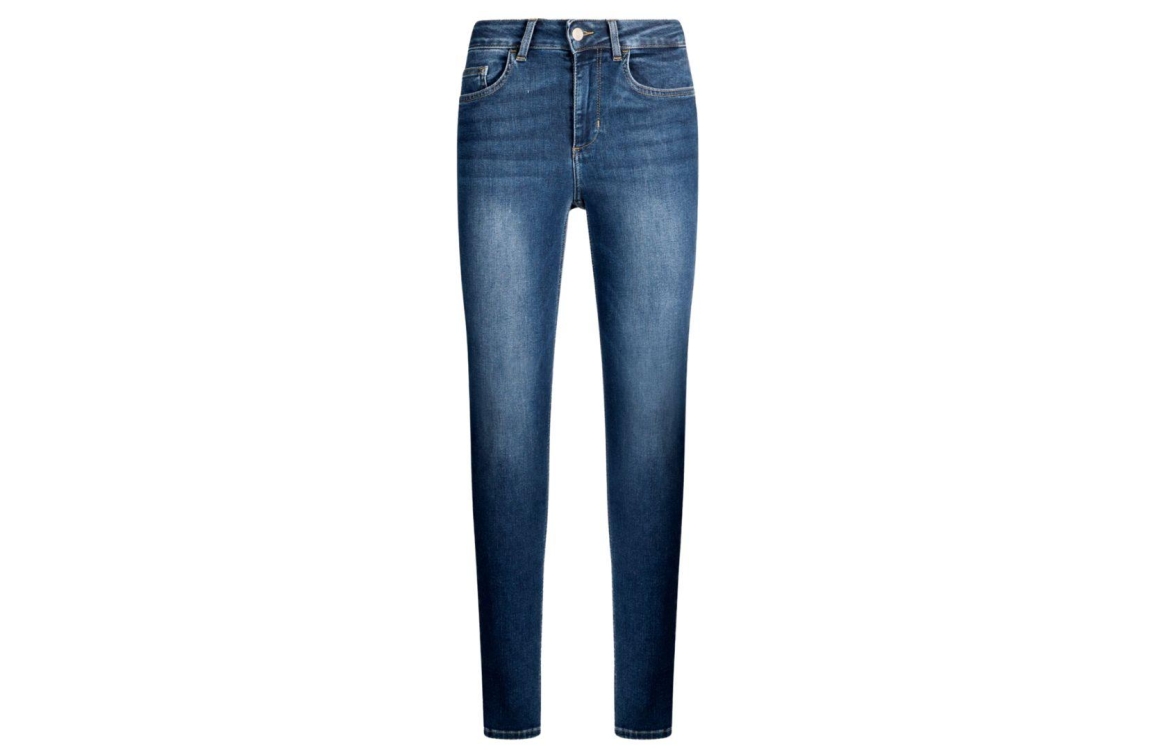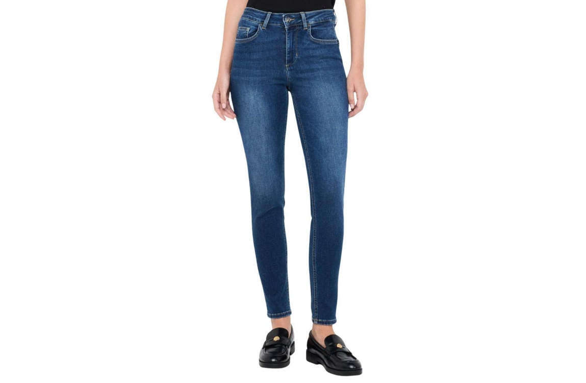Liu Jo jeans UF5013D4615. Dit skinny fit sluit door middel van een knoop en rits afgewerkt met ceintuurlussen. Deze denim van Liu Jo is uitgevoerd in een 5-pocket model en is bij de achterzakken afgewerkt met strass steentjes bewerkt met logo.