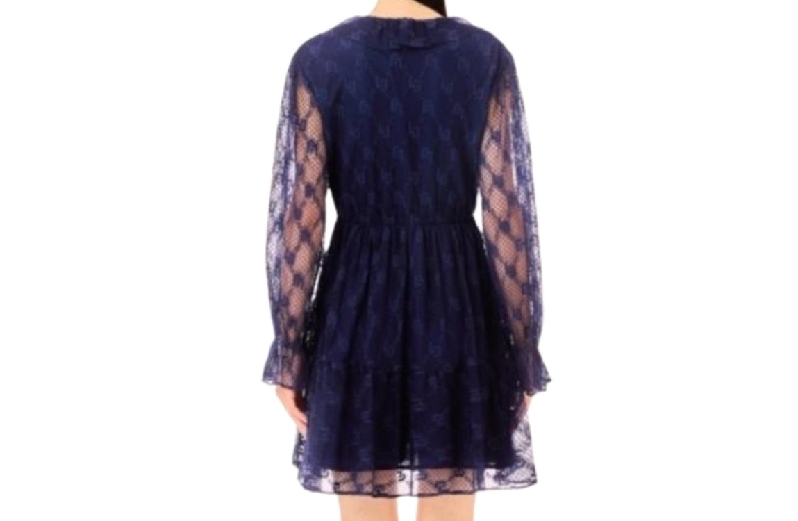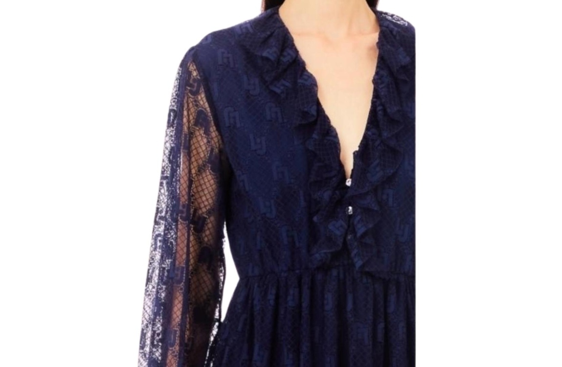 Liu Jo jurk MA4096-J4703. Dit rechtvallend model is voorzien van een v-hals afgewerkt met ruches en heeft lange mouwen. Deze blauwe kanten jurk van Liu Jo sluit door middel van knopen aan de bovenzijde en is all-over bewerkt met het logo. Dit model is onderaan de mouwen en aan de onderzijde afgewerkt met ruches en is gedeeltelijk gevoerd.