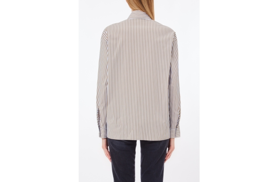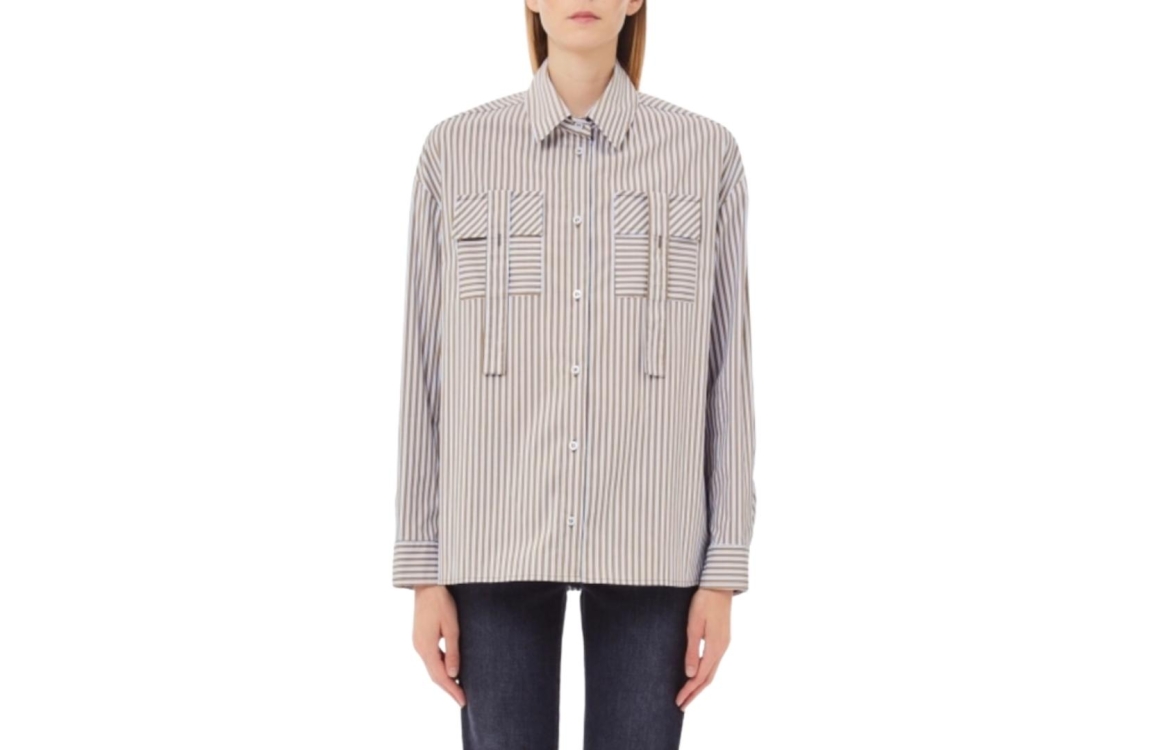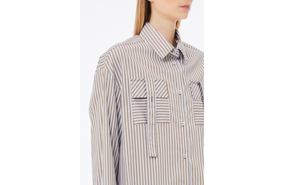 Liu Jo blouse WA5179 T4274. Dit oversized model is voorzien van een kraag en heeft lange mouwen. Deze groene/bruine blouse van Liu Jo sluit door middel van knopen en heeft twee steekzakken aan de voorzijde. Deze blouse is voorzien van strepen.