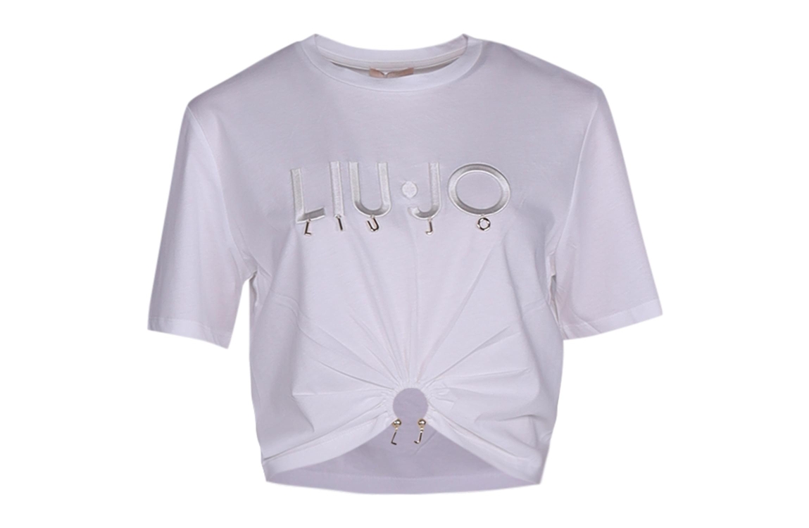Liu Jo top Bianco wa5139js923m9512. Dit cropped model is voorzien van een ronde hals en heeft korte mouwen. Deze witte top van Liu Jo is aan de voorzijde bewerkt met het logo afgewerkt met initialen en beschikt aan de onderzijde van een knoopdetail met initialen.