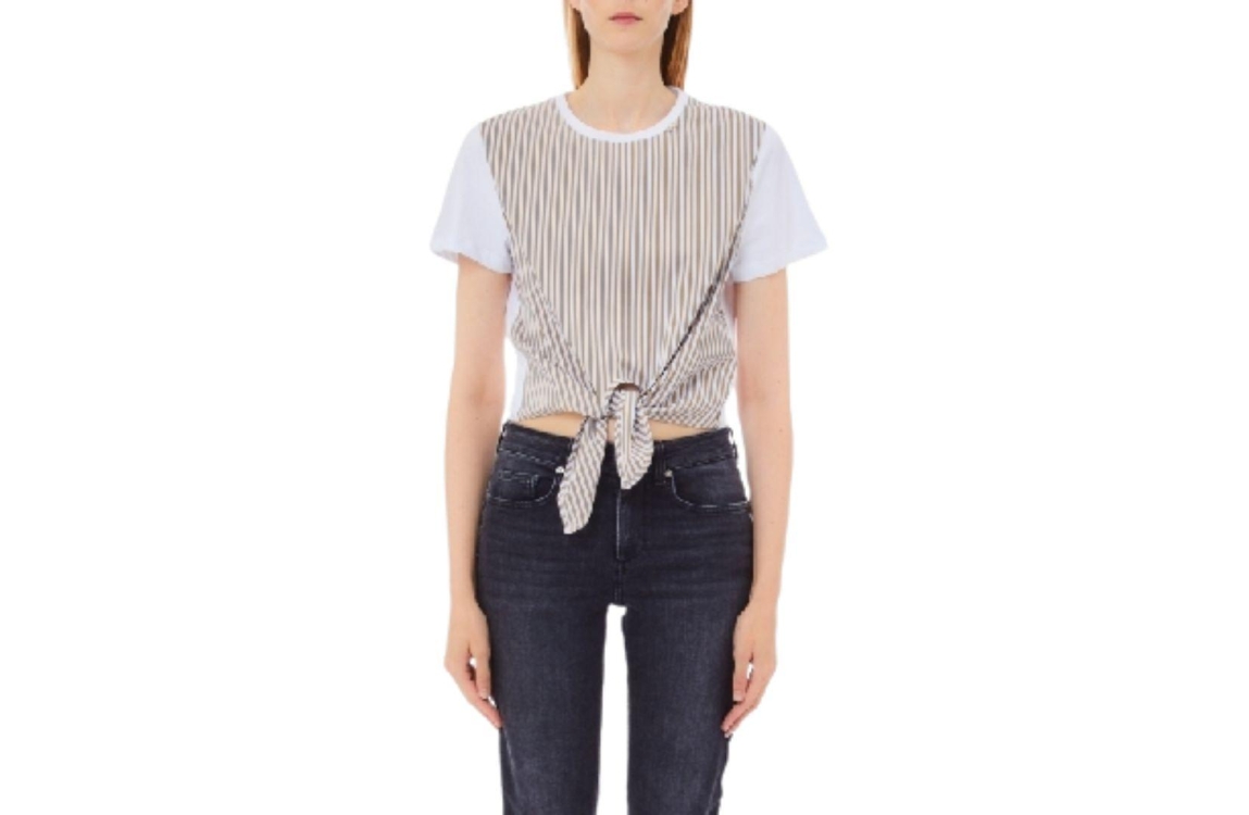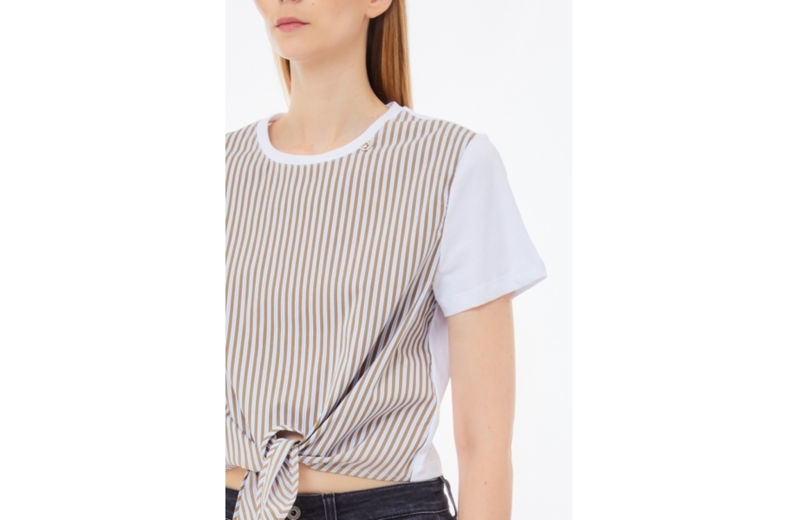 Liu Jo shirt WA5157 J6308. Dit aangesloten model is voorzien van een ronde hals en heeft korte mouwen. Dit groene/bruine shirt van Liu Jo is bewerkt met strepen en kan aan de voorkant gestrikt worden.