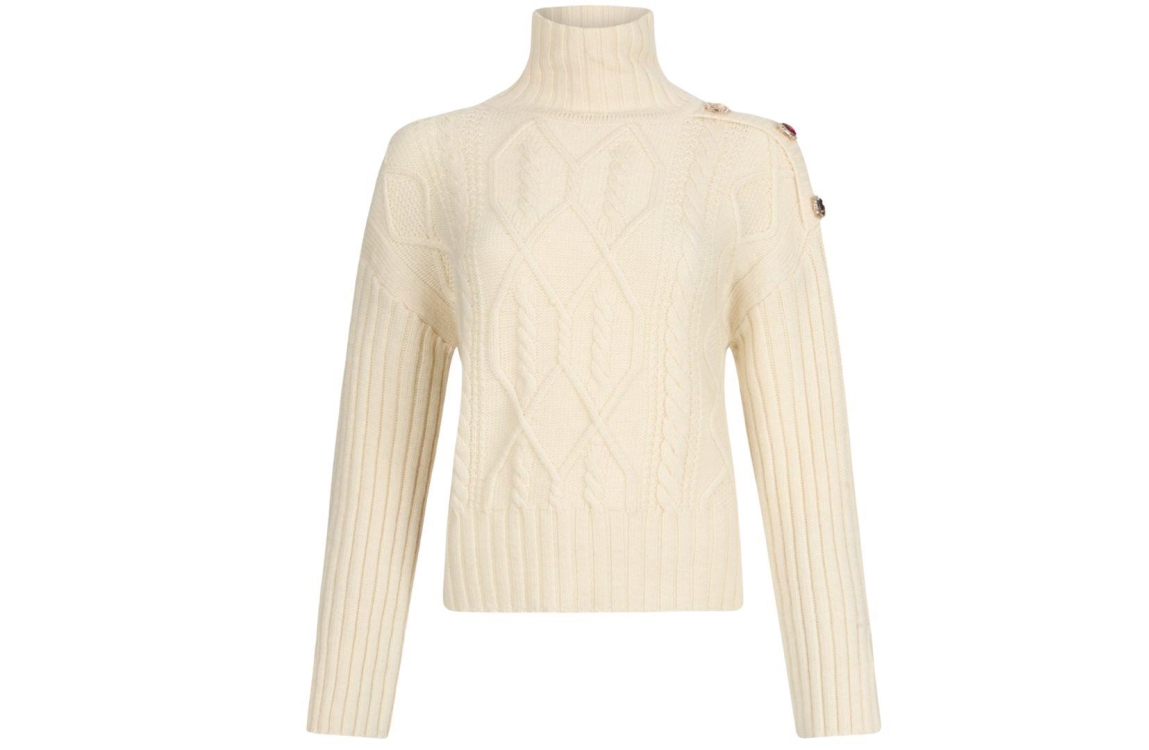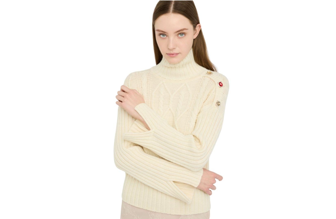 Liu Jo pullover MF5425MS040. Dit rechtvallend model is voorzien van een col en heeft lange mouwen. Deze créme kleurige pullover van Liu Jo is afgewerkt gekleurde met pareldetails op de schouders en is all-over uitgevoerd in een kabelstructuur.