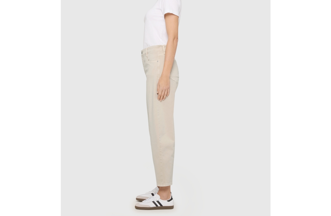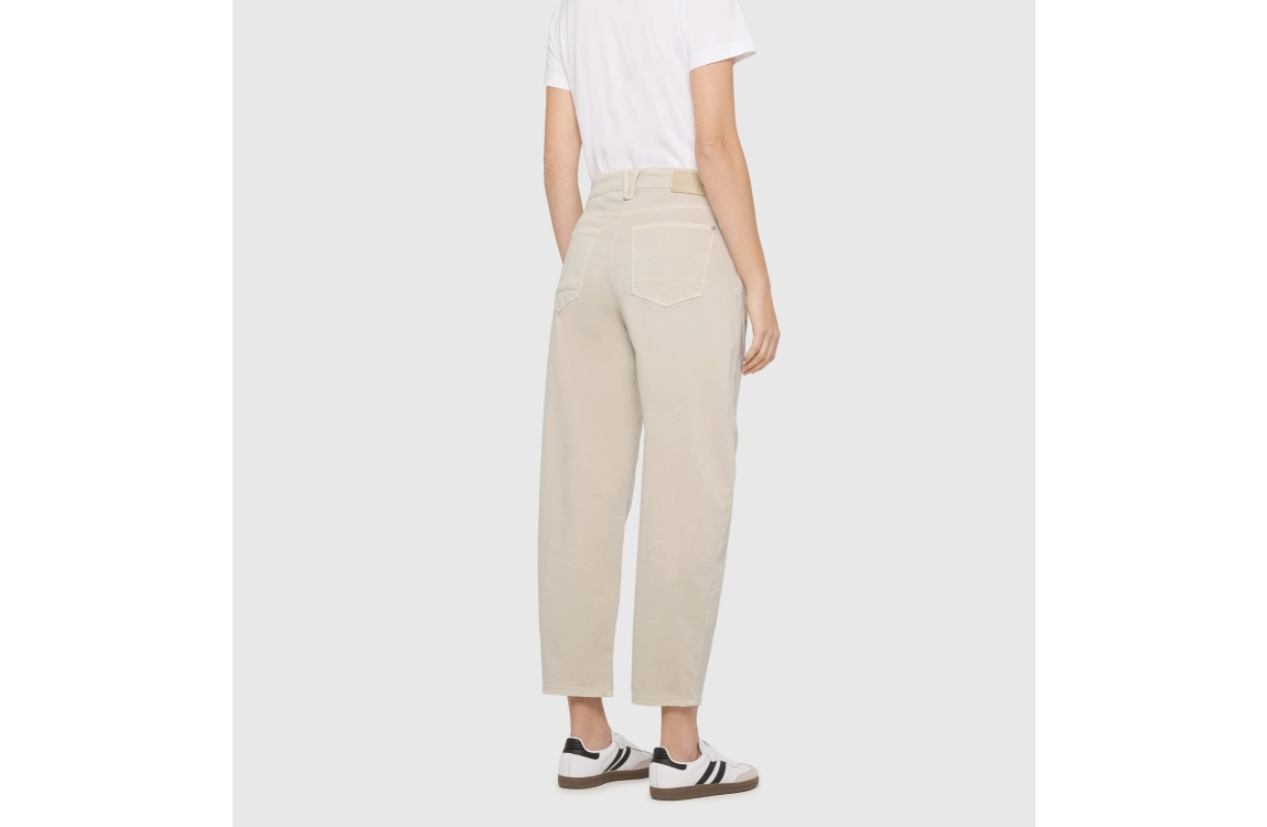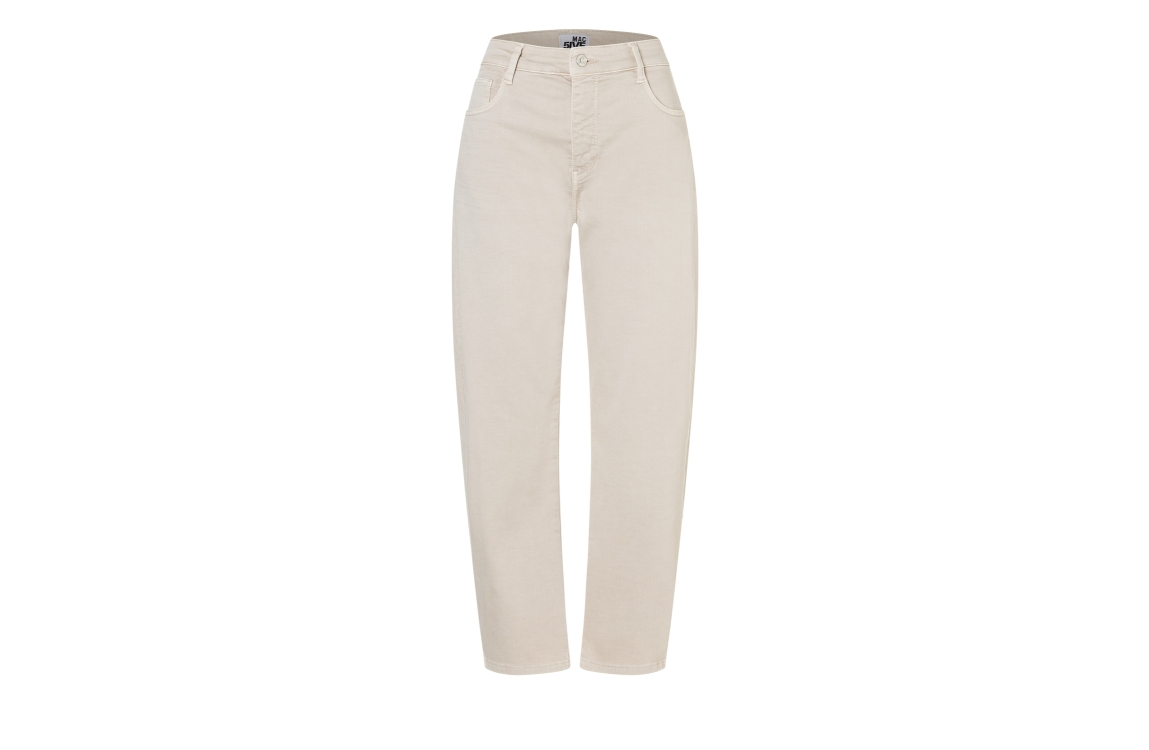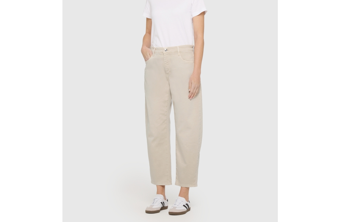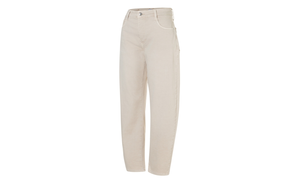 MAC broek DANNI 2.3 0423L310700. Dit barrel leg model sluit door middel van een knoop- en ritssluiting en is voorzien van ceintuurlussen. Deze lichtbeige broek van MAC is uitgevoerd in een 5-pocket model en lichte stretchkwaliteit.