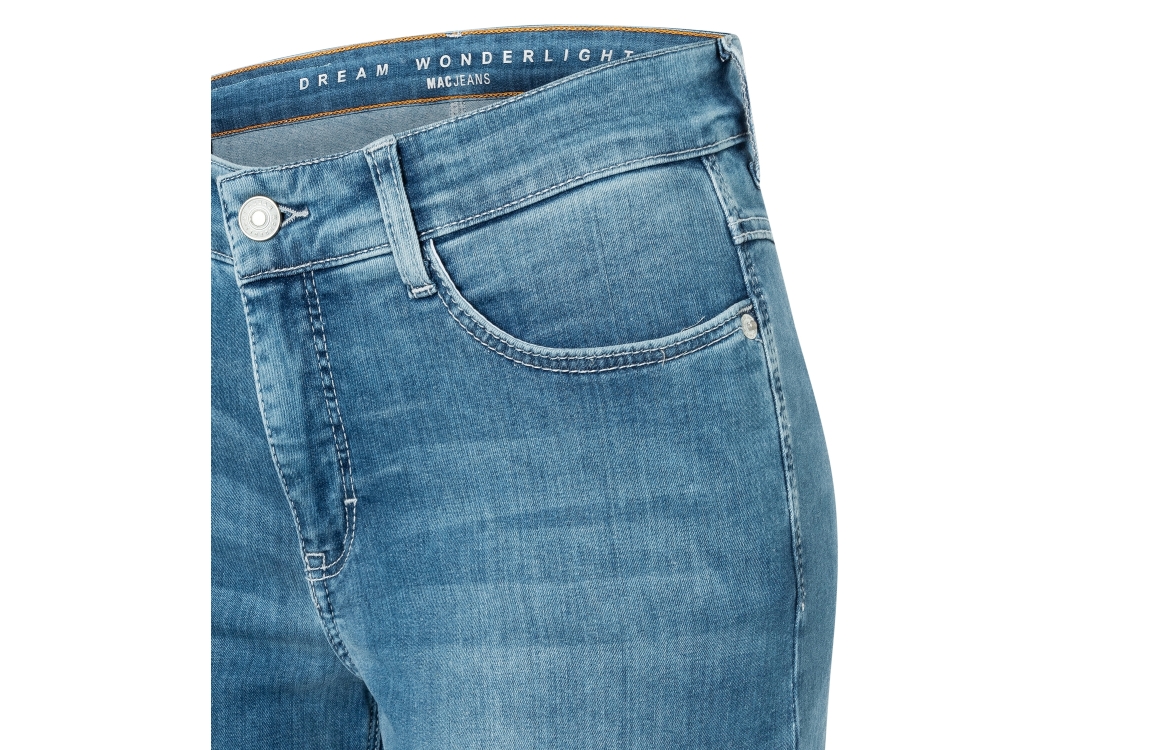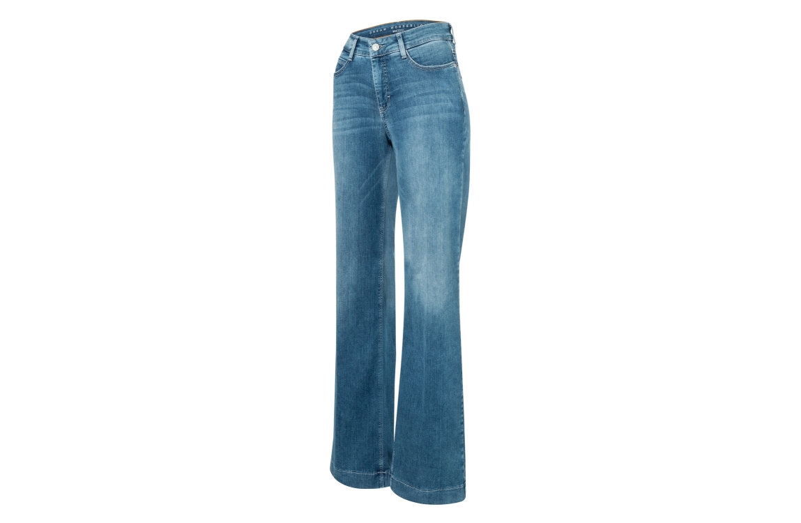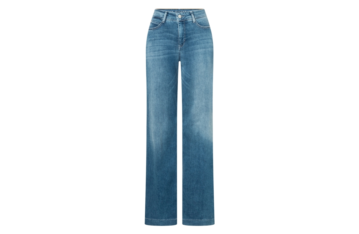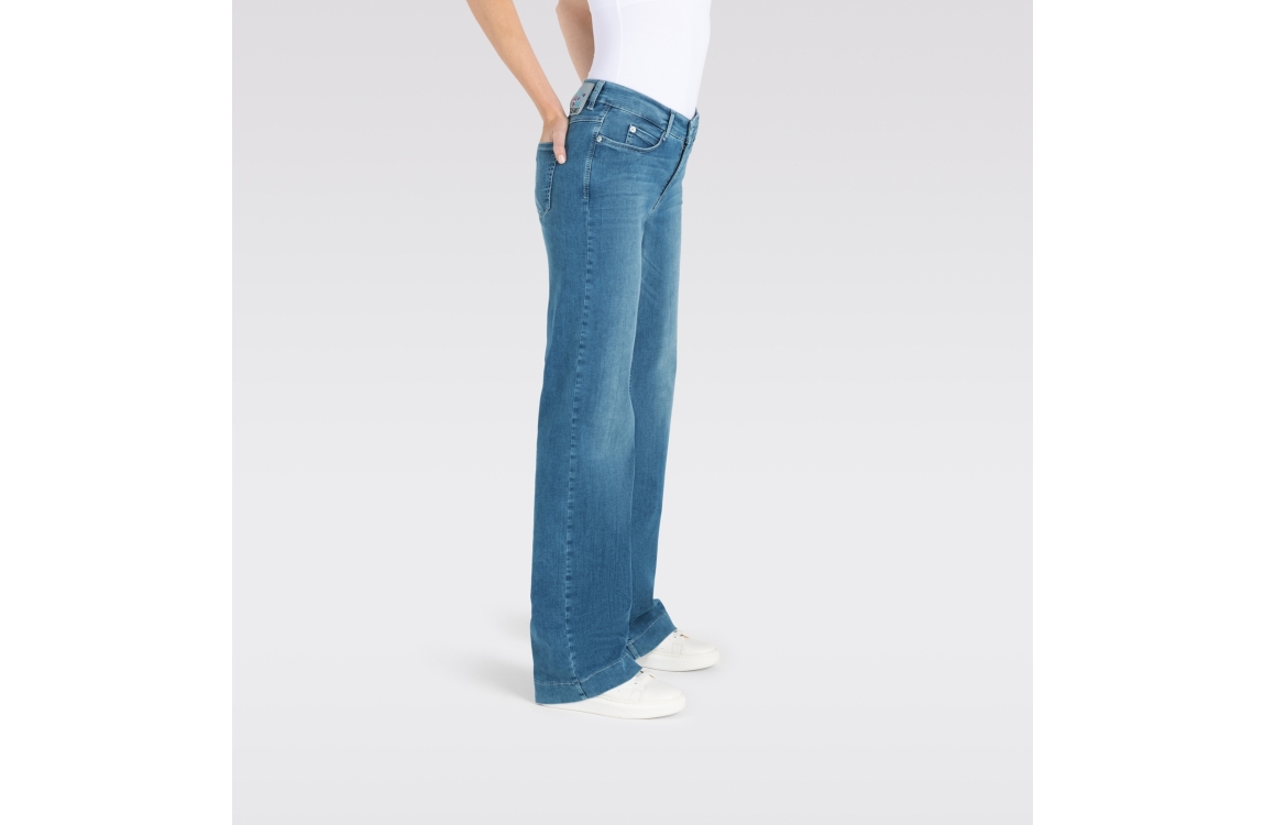 MAC DREAM WIDE D490 jeans 0351L544190. Dit wide leg model sluit door middel van een knoop en een rits. Deze blauwe denim jeans van Mac beschikt over verschillende broekzakken en riemlusjes. Dit model bevat stretch.