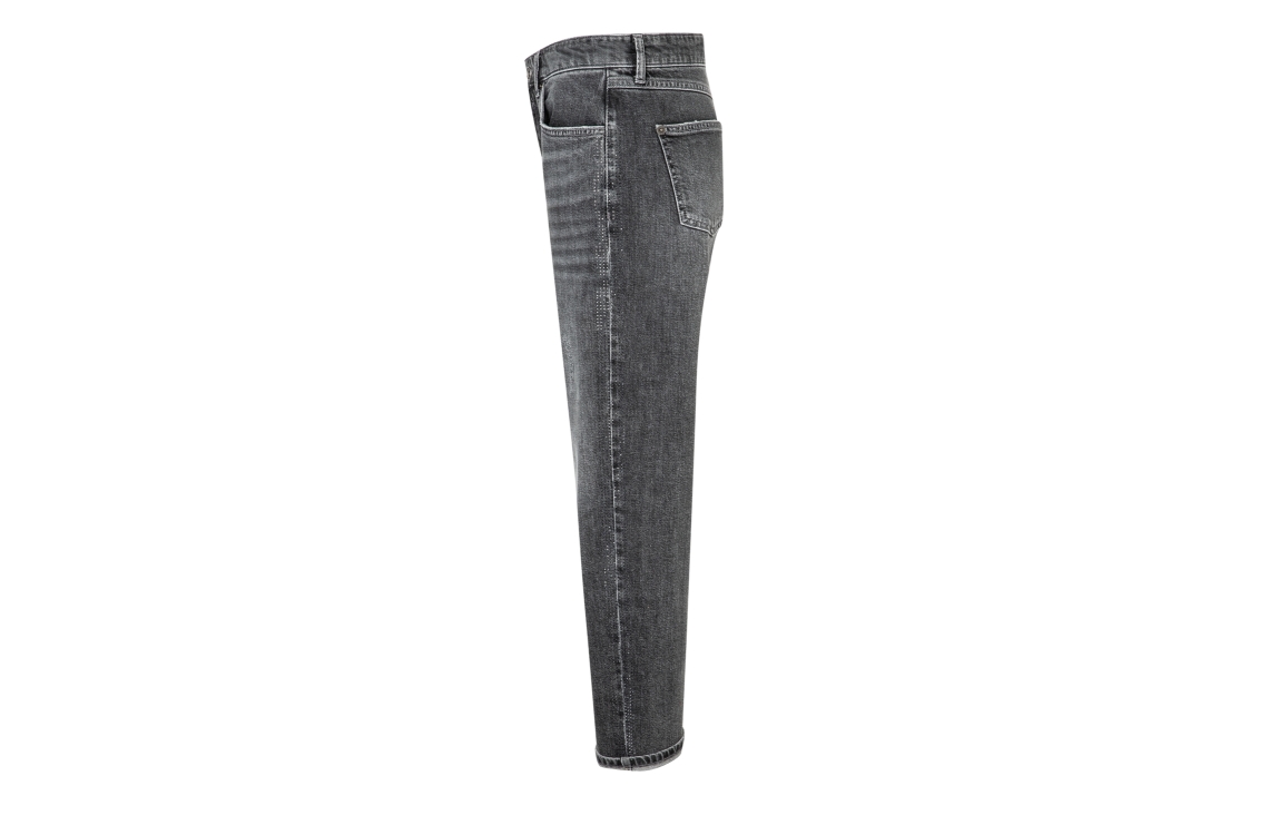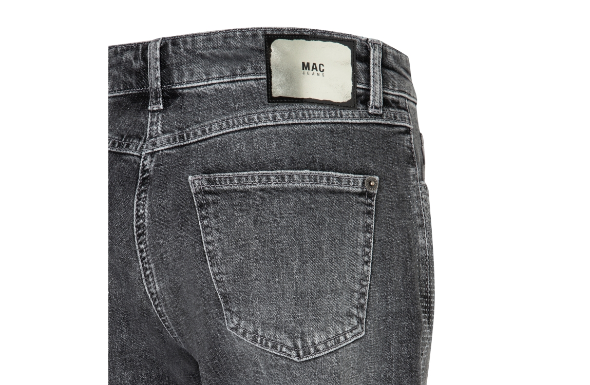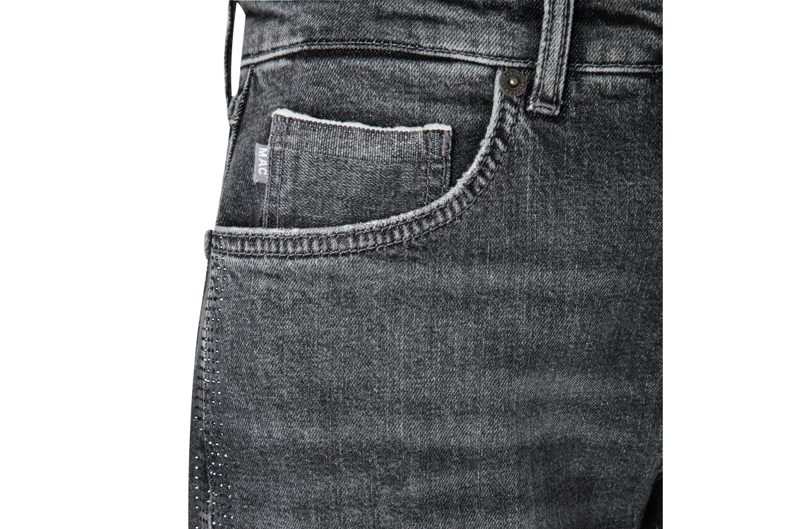 MAC Jeans 036158189E. Dit straigtfit model heeft lange broekspijpen en sluit door een knoop en rits. Deze grijze broek van MAC is afgewerkt met zakken en steentjes.