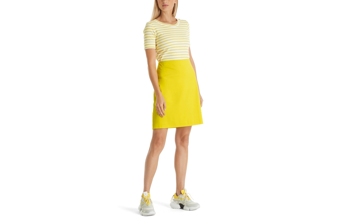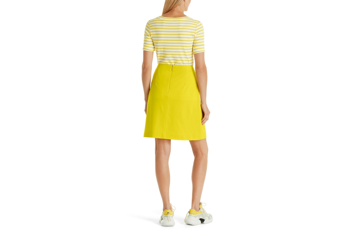 MarcCain Additions rok WA71.01J24. Dit rechtvallende model sluit met een rits en een blinde knoop. Deze gele rok van MarcCain Additions komt ongeveer tot de knie en heeft een onderrok.
