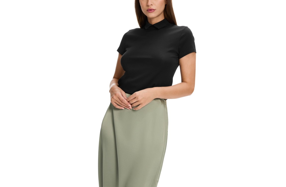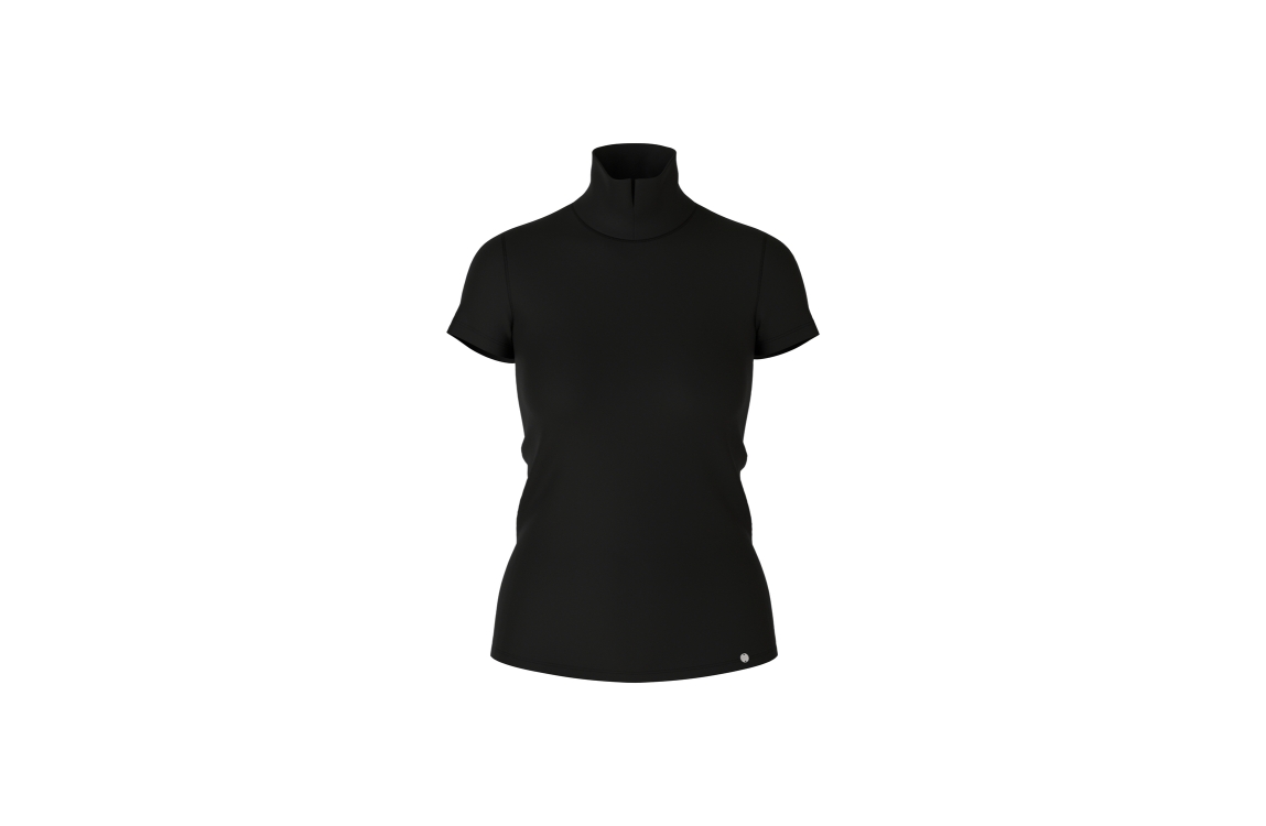 Marc Cain Additions T-shirt XA 48.55 J14. Dit rechtvallend model heeft een hoge mockneck en korte mouwen. Deze zwarte T-shirt van Marc Cain is afgewerkt met een split in de hoge hals en is uitgevoerd in stretch kwaliteit.