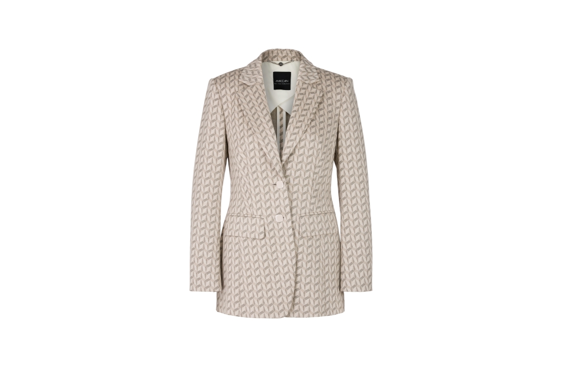 Marc Cain Collections blazer YC 34.16 J19. Dit rechtvallend model heeft een reverskraag en lange mouwen. Deze blazer van Marc Cain Collections is all-over bewerkt met een grafische print in verschillende kleuren en sluit aan de voorzijde door middel van twee detailknopen. Dit model is voorzien van twee klepzakken aan de voorzijde en beschikt over schoudervulling.
