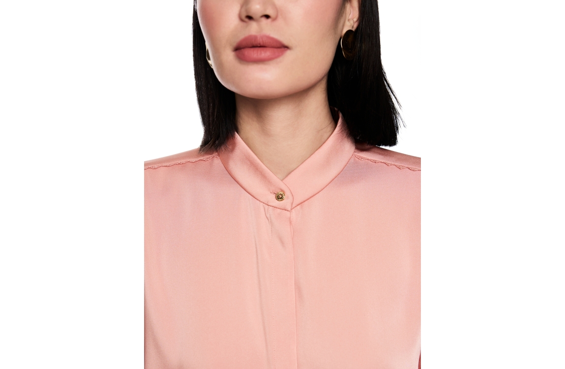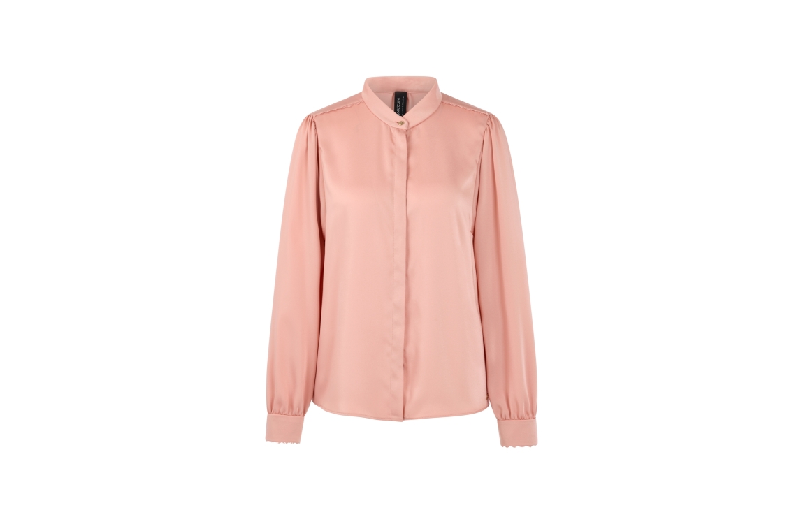 Marc Cain Collections blouse AC 51.10 W08. Dit rechtvallend model is voorzien van een ronde hals en heeft lange mouwen. Deze roze satijnenlook blouse van Marc Cain sluit door middel van knopen en is bij de schouders en mouwen afgewerkt met kanten details.