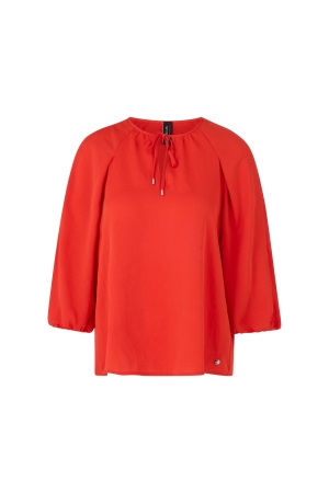 Marc Cain Collections top YC-51.31-W39. Dit rechtvallend rode model is voorzien van een ronde hals dat sluit door middel van een strikkoord en heeft driekwart mouwen.