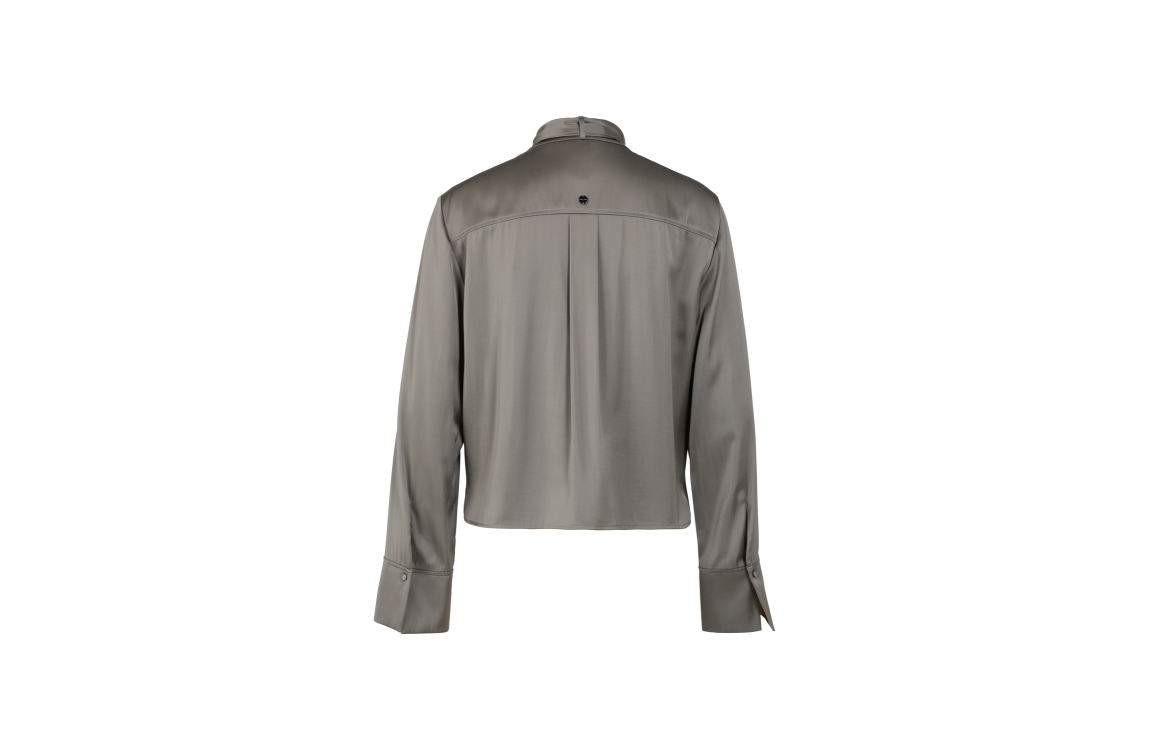 MarcCain Collections Bluse 836 Soft charcoal. Dit rechtvallende model is voorzien van een ronde hals met een afneembaar strik en heeft lange mouwen. Deze grijze satijnen look blouse van MarcCain sluit door middel van knopen.
