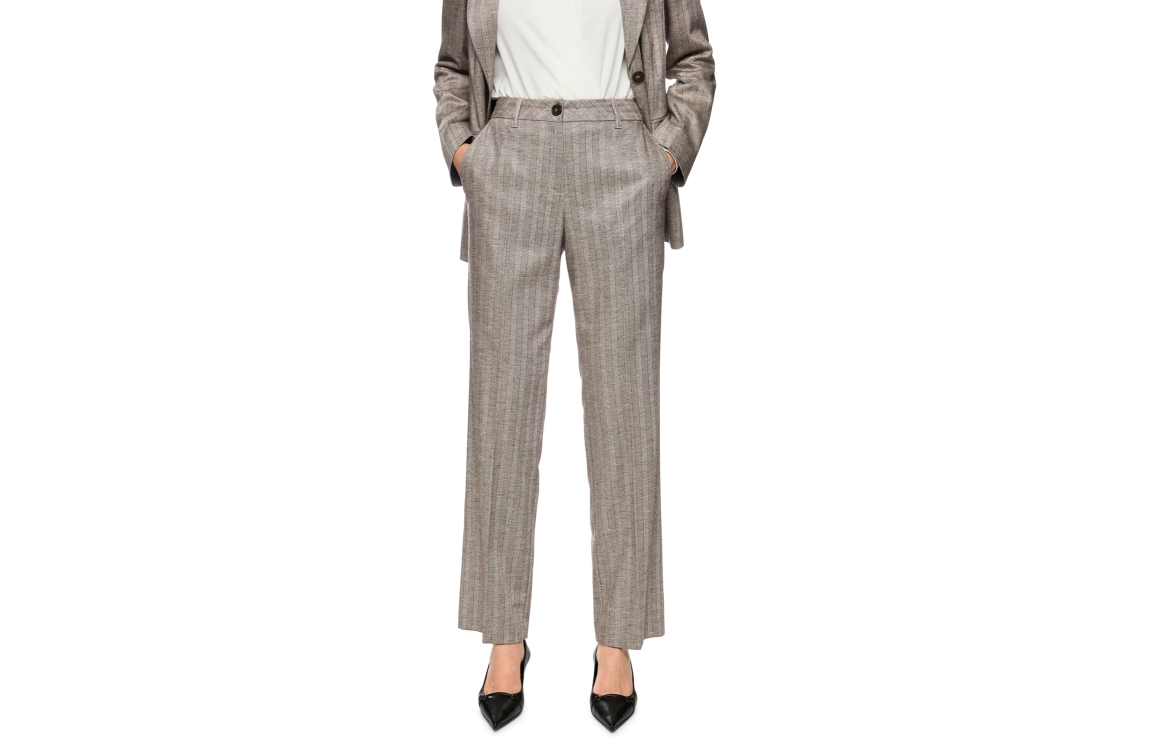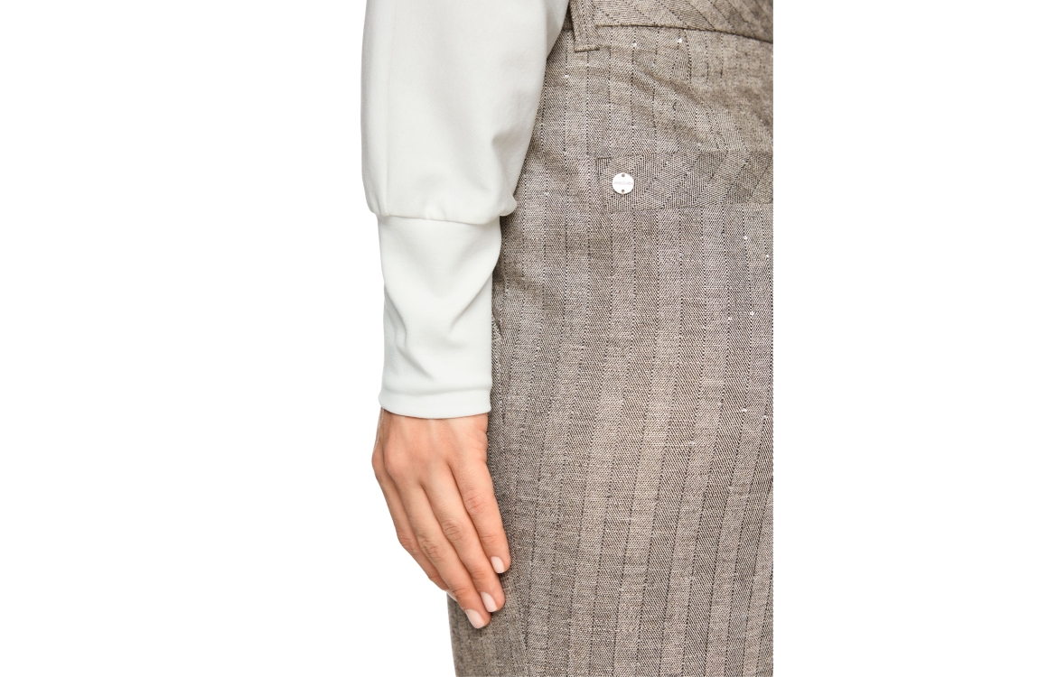MarcCain Collections FENDOU 836 pantalon ZC 81.25 W73. Dit rechtvallende model sluit door middel van een knoop en rits. Deze grijze pantalon van MarcCain is bewerkt met steekzakken, riemlusjes en strass-steentjes.