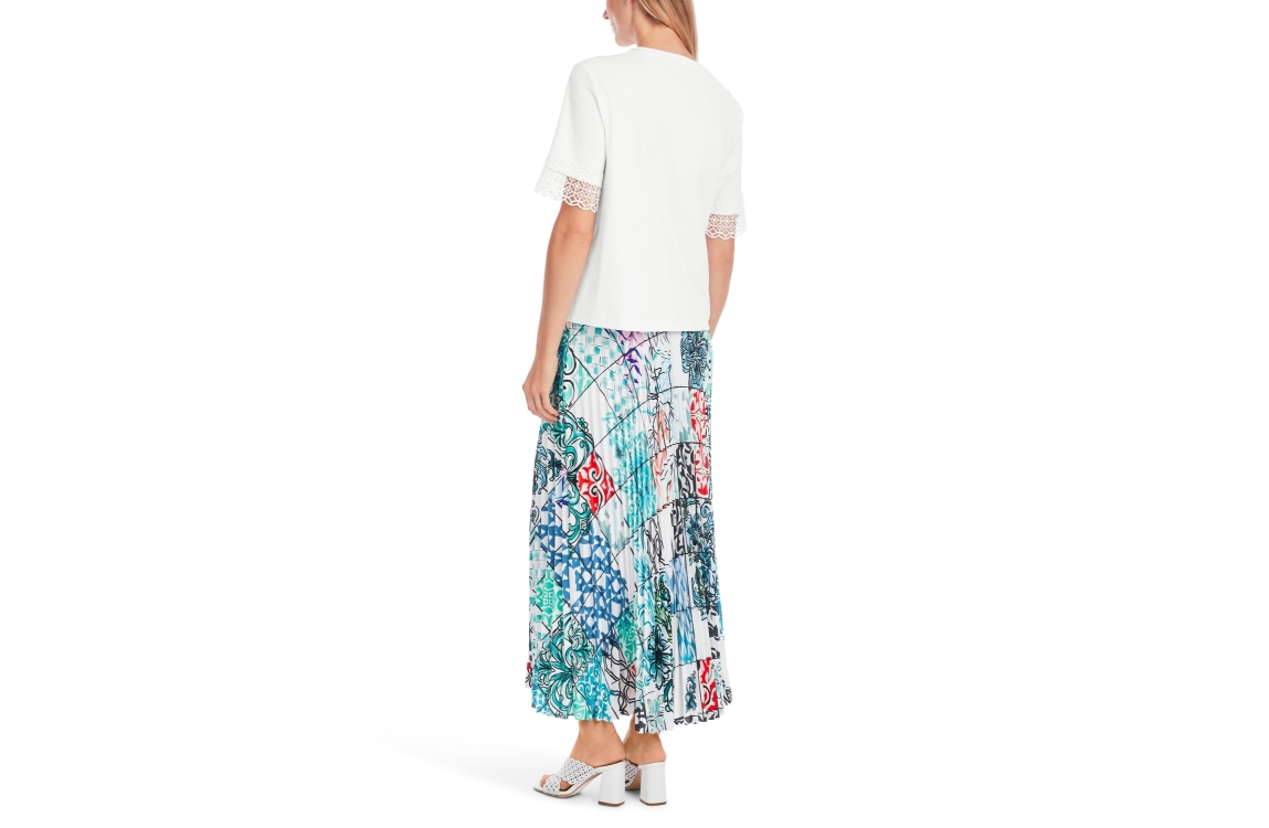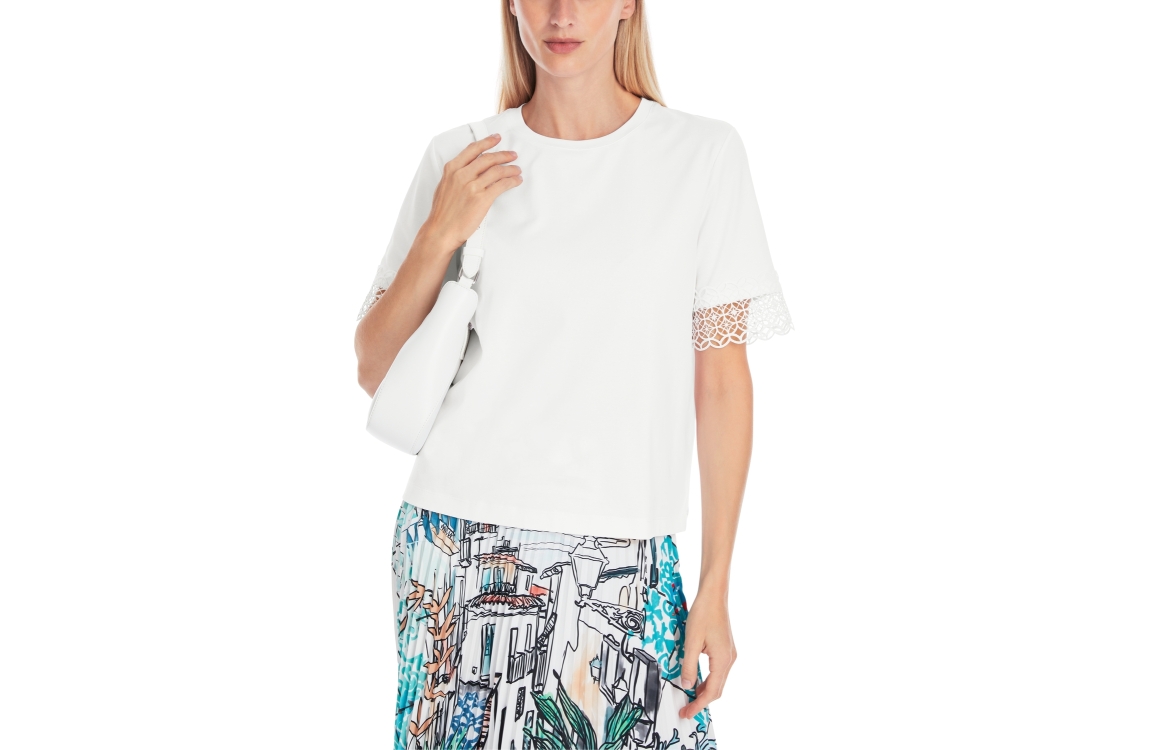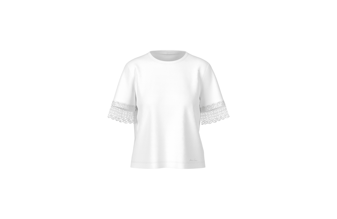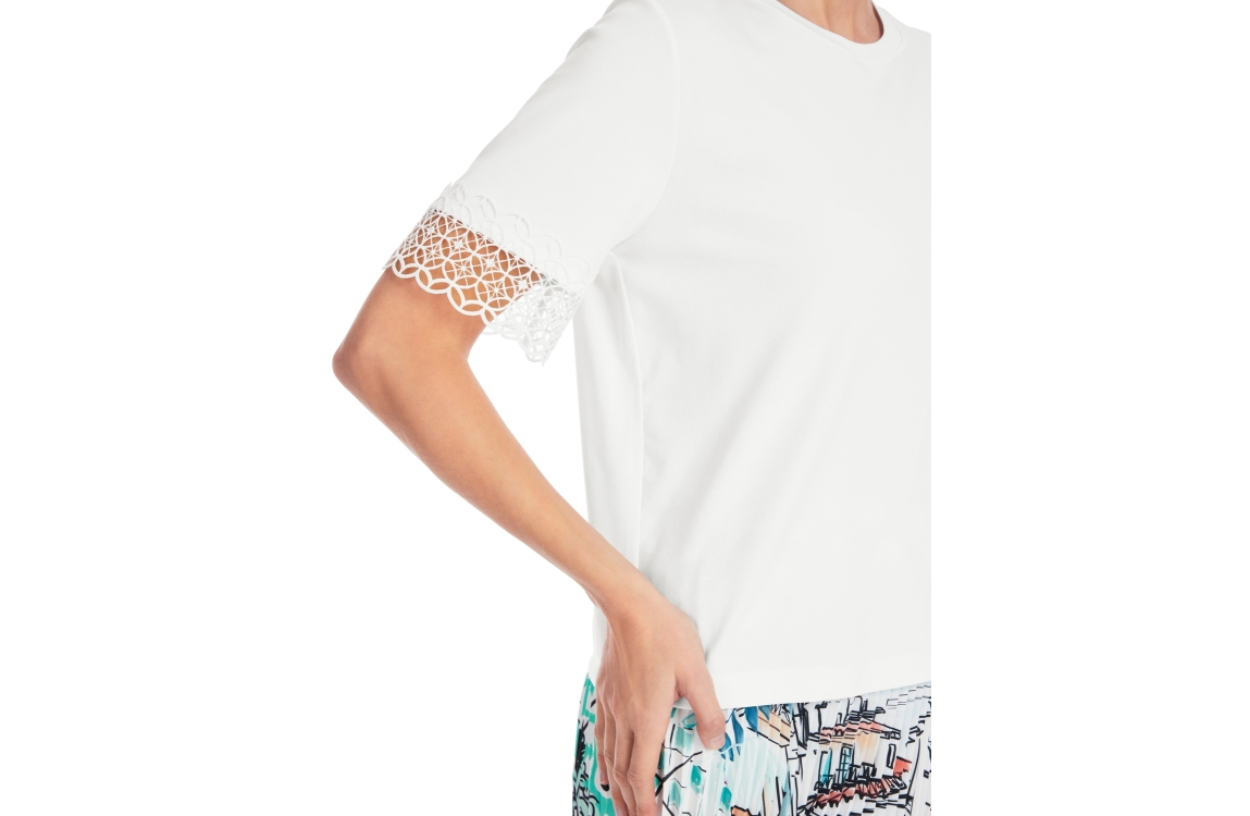 Marc Cain Collections T-shirt YC-48.44-J14. Dit rechtvallend witte model is voorzien van een ronde hals en heeft korte mouwen afgewerkt met kanten detail aan de uiteinden.