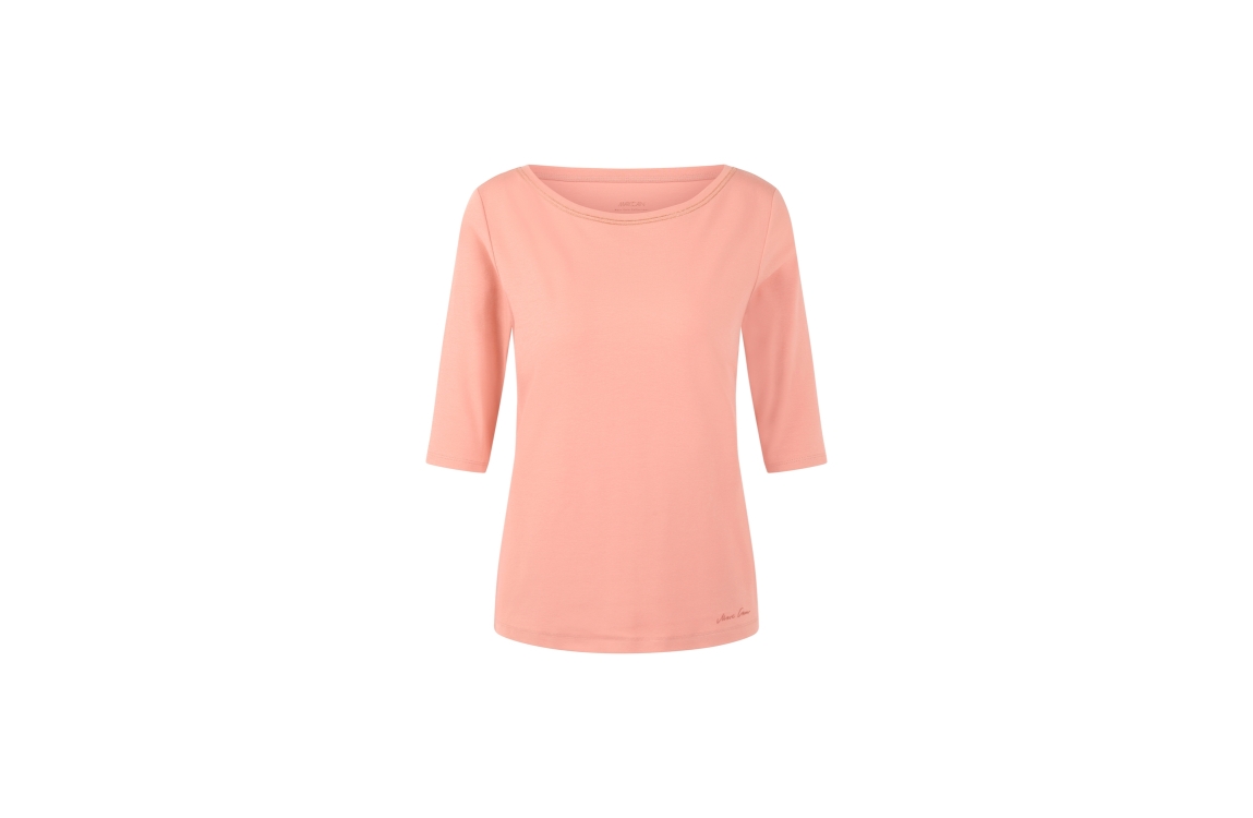 Marc Cain Collections T-shirt AC 48.16 J15. Dit rechtvallend model is voorzien van een ronde hals bewerkt met goudkleurige boord en heeft korte mouwen. Deze perzikkleurige T-shirt van Marc Cain is afgewerkt met logo aan de onderzijde.