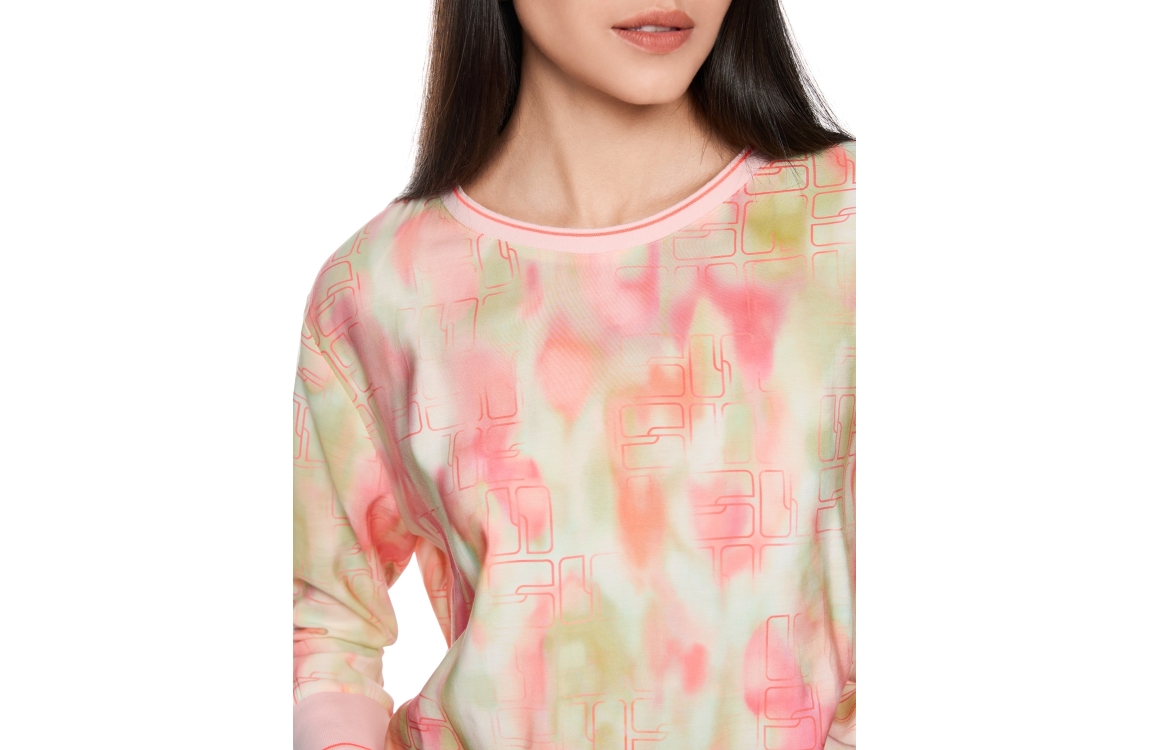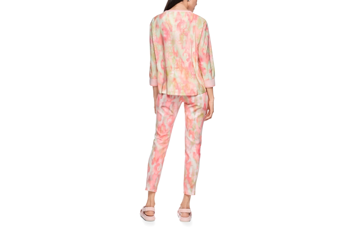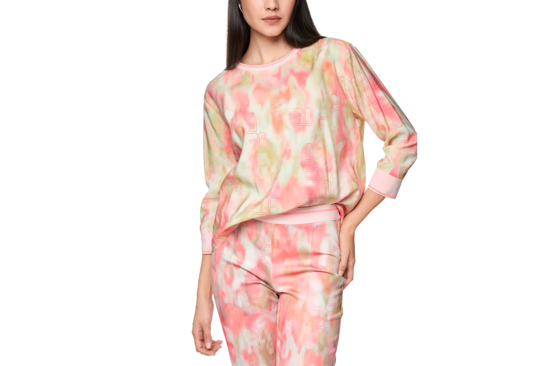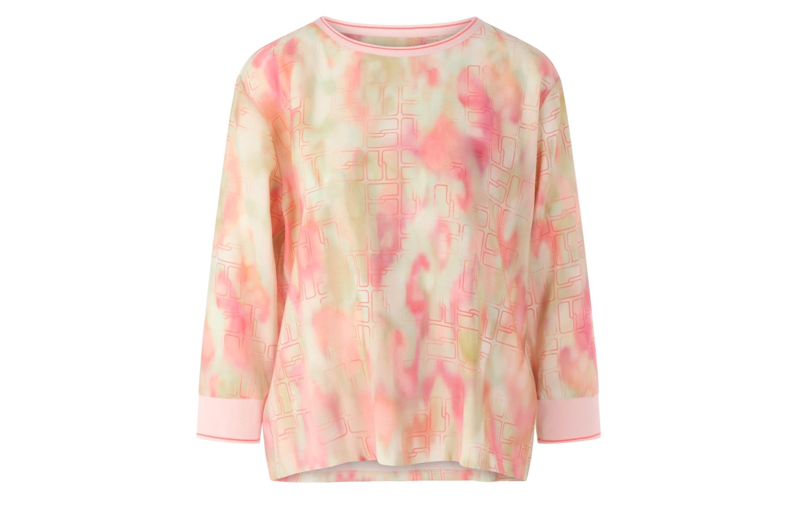 MarcCain Sports Bluse 231 Candelight peach. Dit soepelvallende model is voorzien van een ronde hals en heeft driekwart mouwen. Deze roze blouse van MarcCain is all-over bewerkt met een kleurrijke print en is afgewerkt met gebreide boorden.