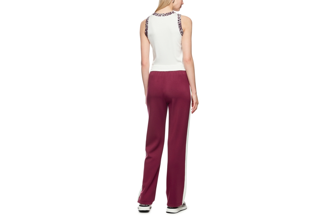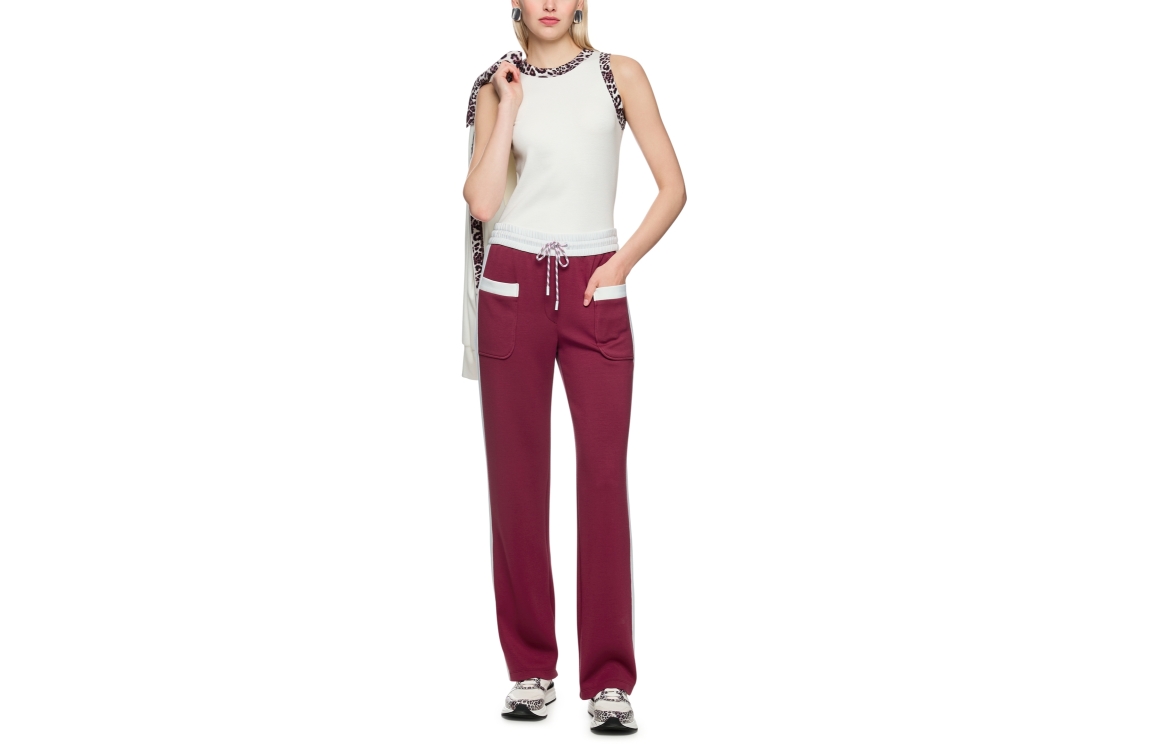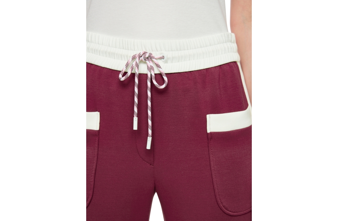 Marc Cain Sports broek AS 81.15 J06. Dit straight fit model sluit door middel van een elastische boord met trekkoorden. Deze bordeauxrode/witte broek van Marc Cain Sports beschikt over opgestikte zakken aan de voorzijde en is bewerkt met een bies aan de zijkanten. Dit model is uitgevoerd in een zachte sweat kwaliteit.