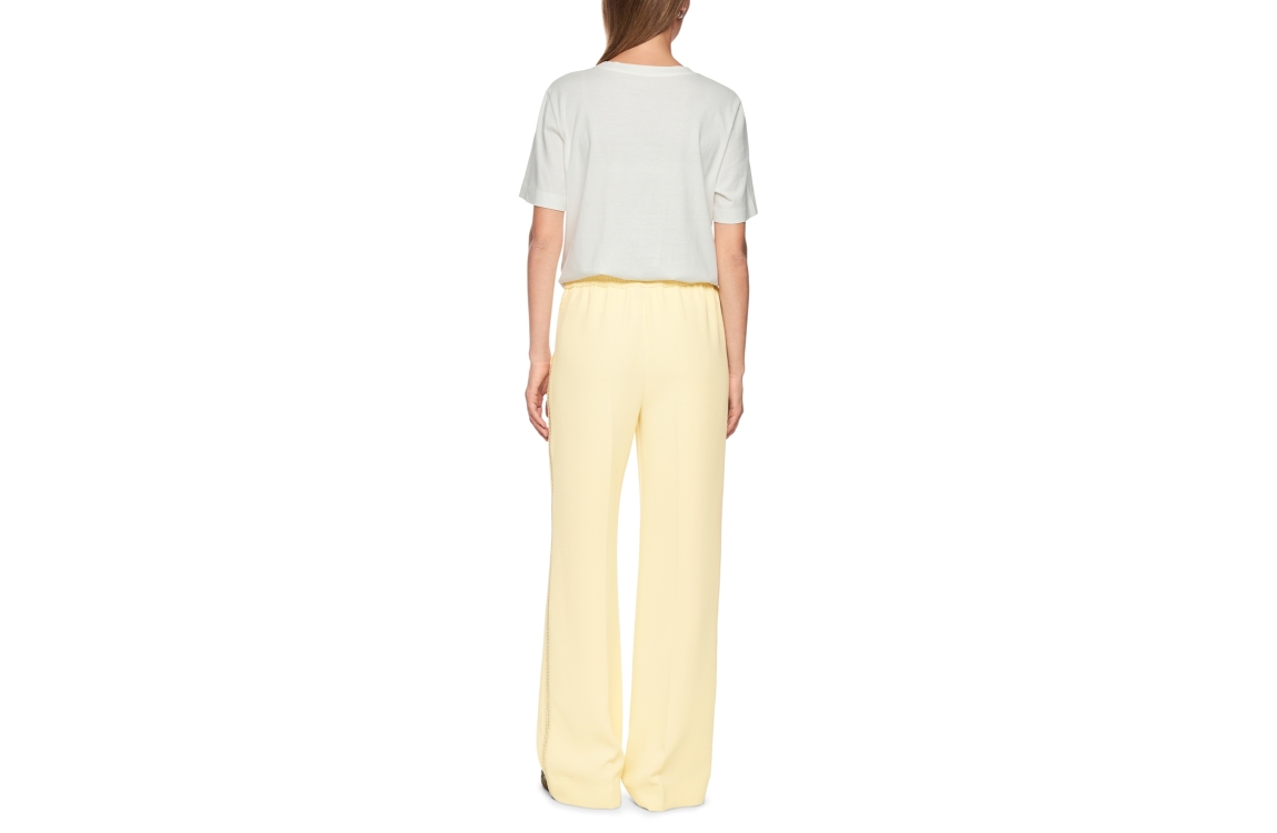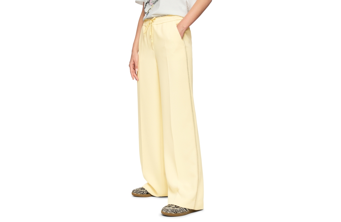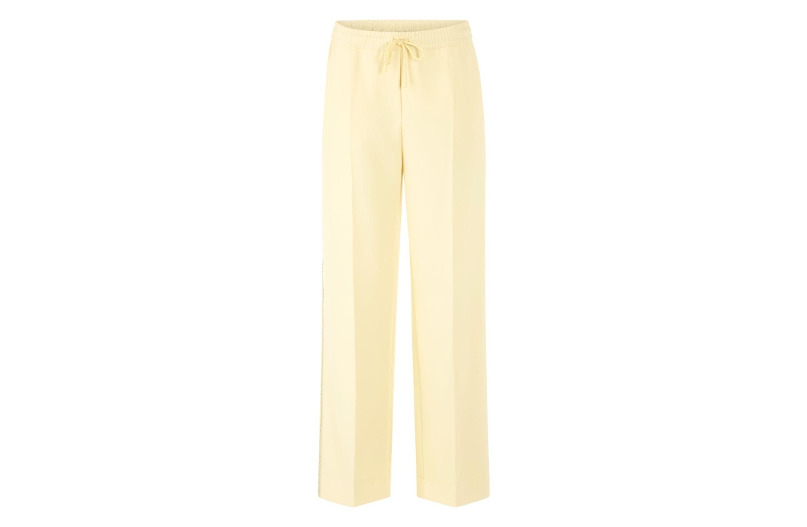 MarcCain Sports Hose WELKOM 407 Flan. Dit soepelvallende model sluit door middel van een elastische boord met trekkoorden. Deze gele broek van Marc Cain Sports beschikt over twee steekzakken aan de voorzijde en is bewerkt met een bies aan de zijkanten.