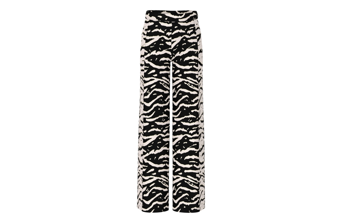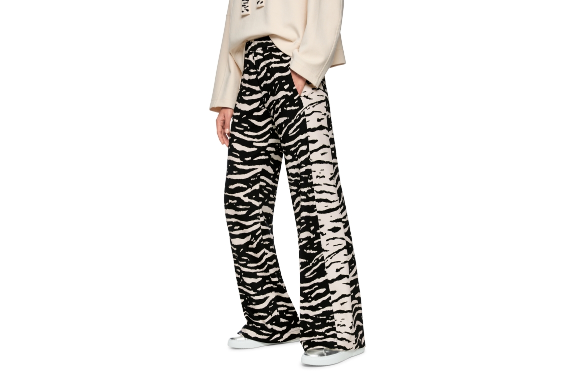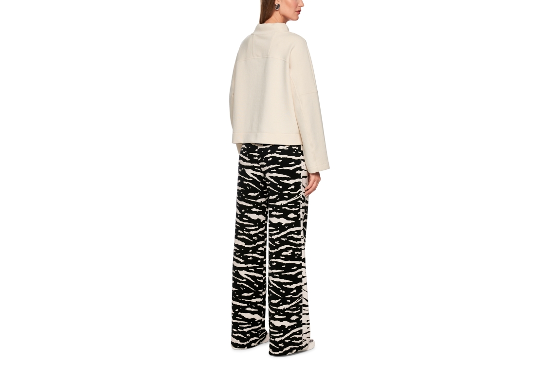 Marc Cain Sports broek AS 81.13 J03. Dit wide leg model sluit door middel van een elastische boord en is voorzien van twee steekzakken aan de voorzijde. Deze zwarte/offwhite broek van Marc Cain Sports is bewerkt met een zebraprint en is afgewerkt met lichtgele details.