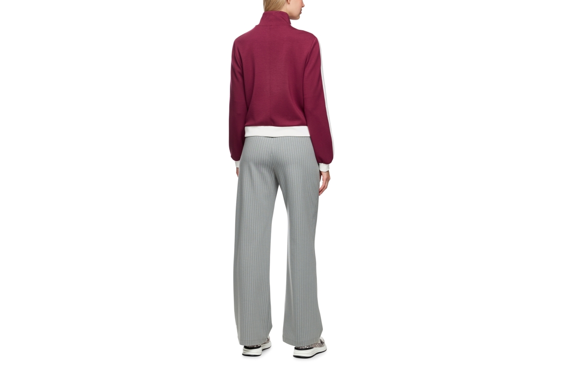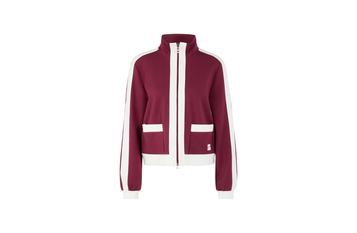 Marc Cain Sports jasje AS 31.06 J06. Dit rechtvallend model is voorzien van een hoge ronde hals en heeft lange mouwen. Deze bordeauxrode/witte jasje van Marc Cain Sports sluit door middel van een dubbele rits en beschikt oevr twee opgestikte zakken. Dit model is uitgevoerd in een zachte sweat kwaliteit.