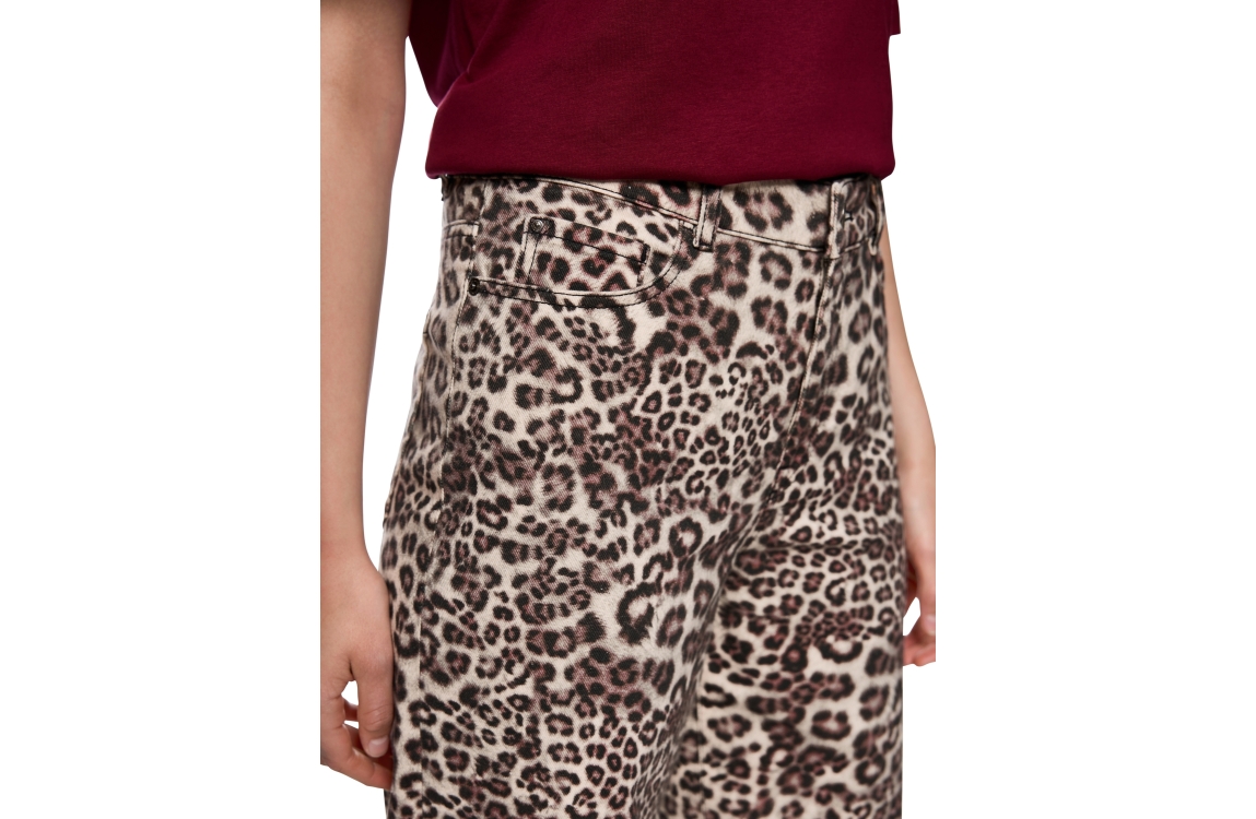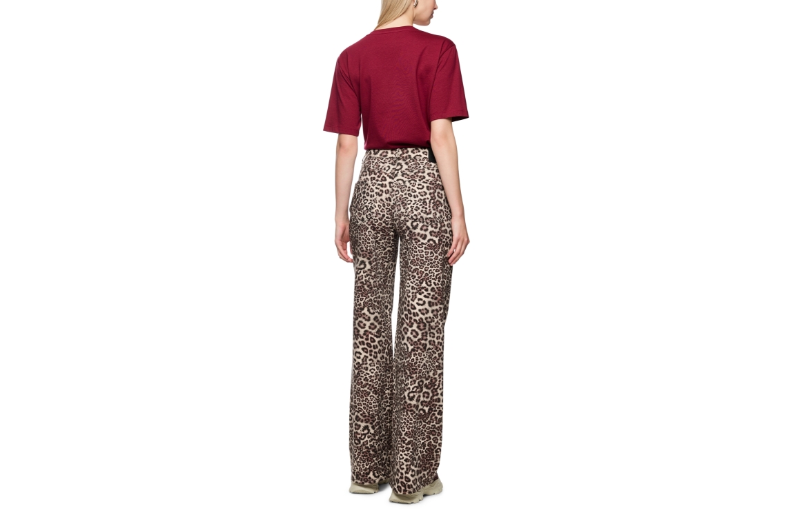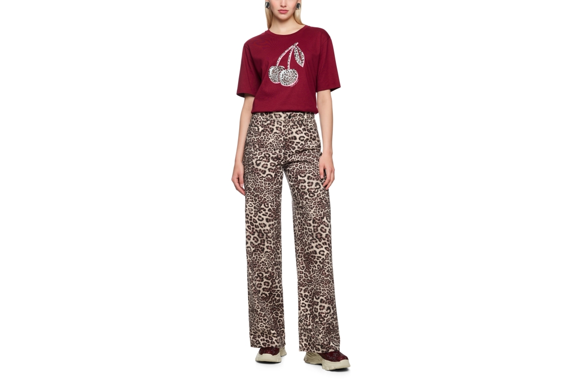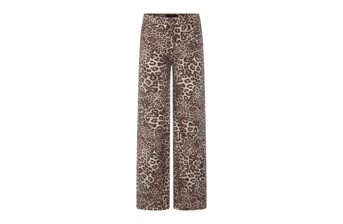 Marc Cain Sports broek AS 82.20 D09. Dit wide leg model sluit door middel van een knoop en rits afgewerkt met ceintuurlussen. Deze rode/grijze jeans van Marc Cain beschikt over een 5-pocket model en is all-over bewerkt met panterprint.