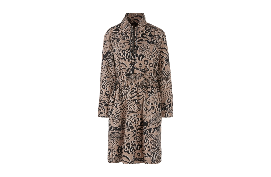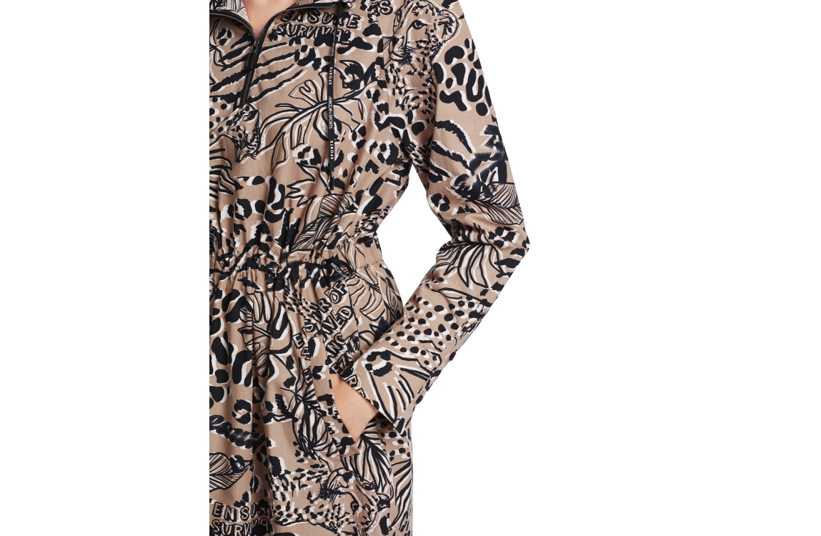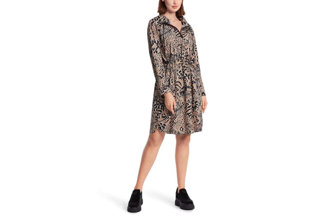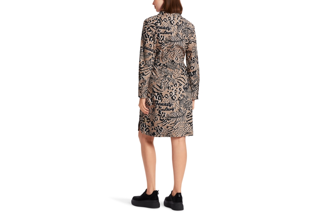 Marc Cain Sports jurk WS21.07W06. Dit rechtvallend model is voorzien van een opstaande kraag met een trekkoord sluit met een rits voor en heeft lange mouwen. Deze camelkleurige jurk van Marc Cain Sports is all-over bewerkt met een print, heeft steekzakken en is voorzien van een verstelbare elastische band in de taille.