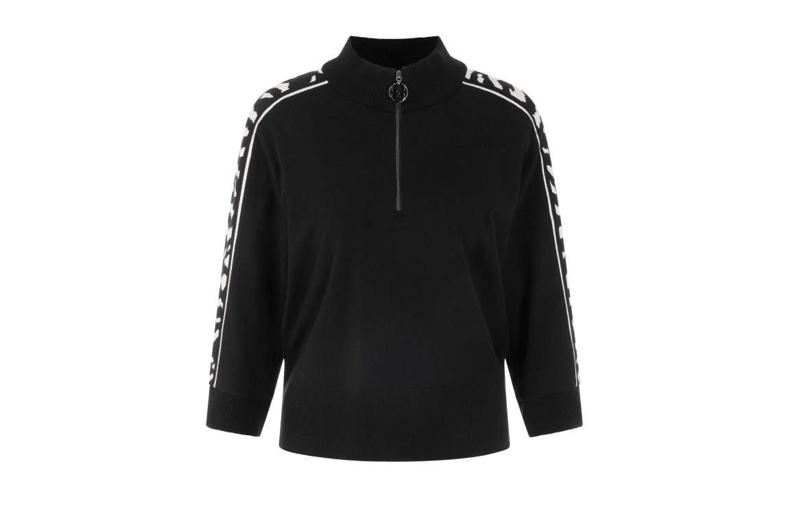 MarcCain Sports Pullover 900 Black. Dit rechtvallende model is voorzien van een opstaande kraag met een rits en driekwart mouwen. Deze zwarte pullover van MarcCain is op de mouw bewerkt met een brede contrasterende streep in dierenprint. Dit model heeft een kraag en zoom die afgewerkt zijn met brede geribde boorden.