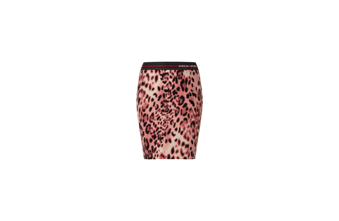 Marc Cain Sports rok VS71.30J07. Dit aangesloten model sluit door middel van een elastische tailleband bewerkt met het logo en is voorzien van een onderrok. Deze rode rok van Marc Cain is all-over bewerkt met een print in de kleuren zwart en beige.