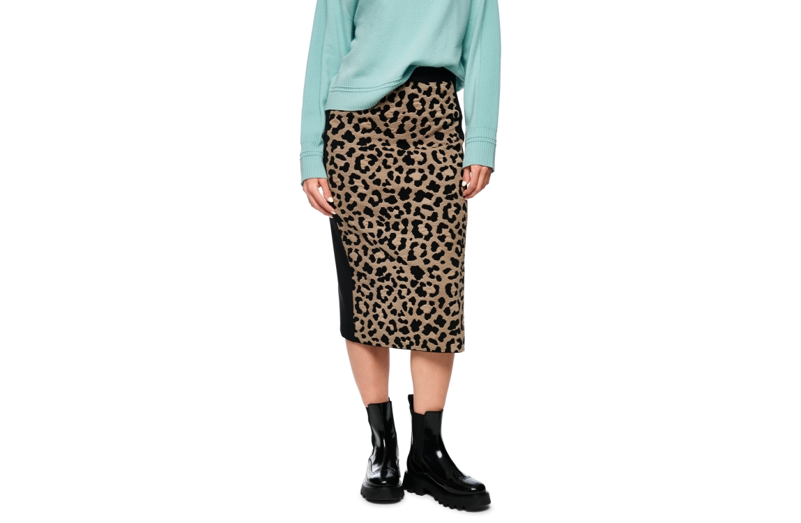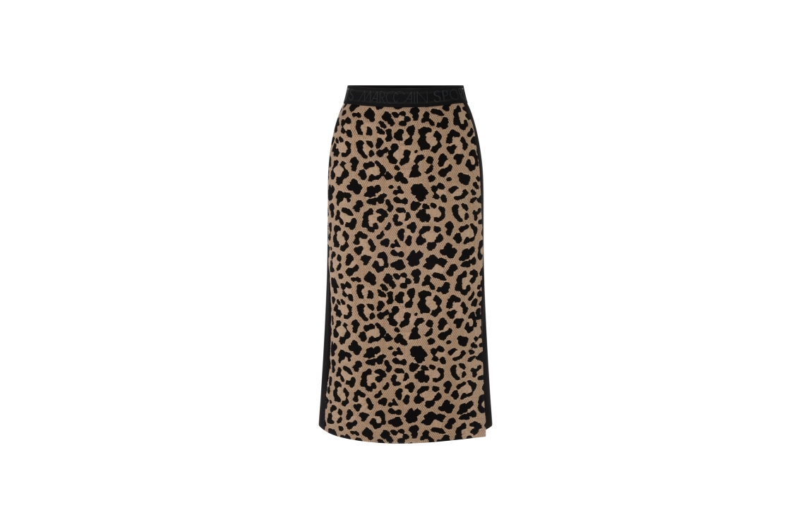 MarcCain Sports rok ZS 71.15 M34. Dit rechtvallende model sluit aan de bovenzijde door middel van een elastische boord. Deze zwarte rok van MarcCain is bewerkt met een panterprint en subtiele splitjes aan de onderzijde.