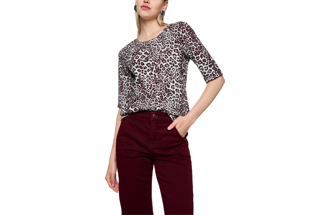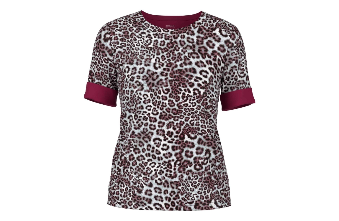 MarcCain Sports T-Shirt 293 Rhododendron. Dit rechtvallende model is voorzien van een ronde hals en korte mouwen. Deze rode top van Marc Cain is bewerkt met een panterprint.