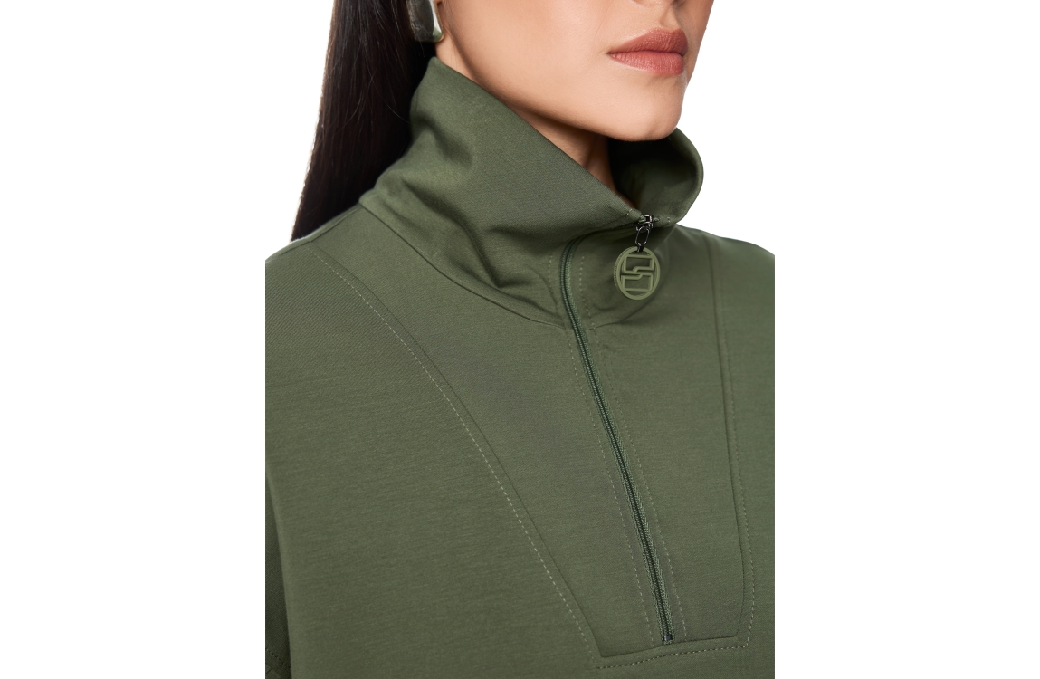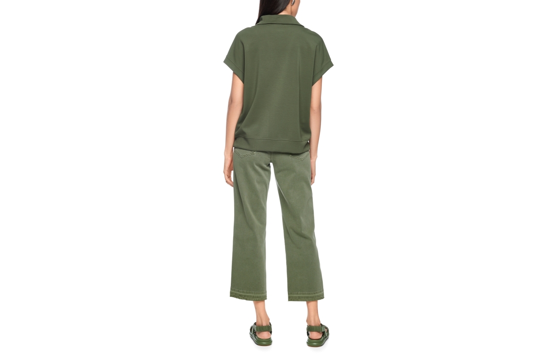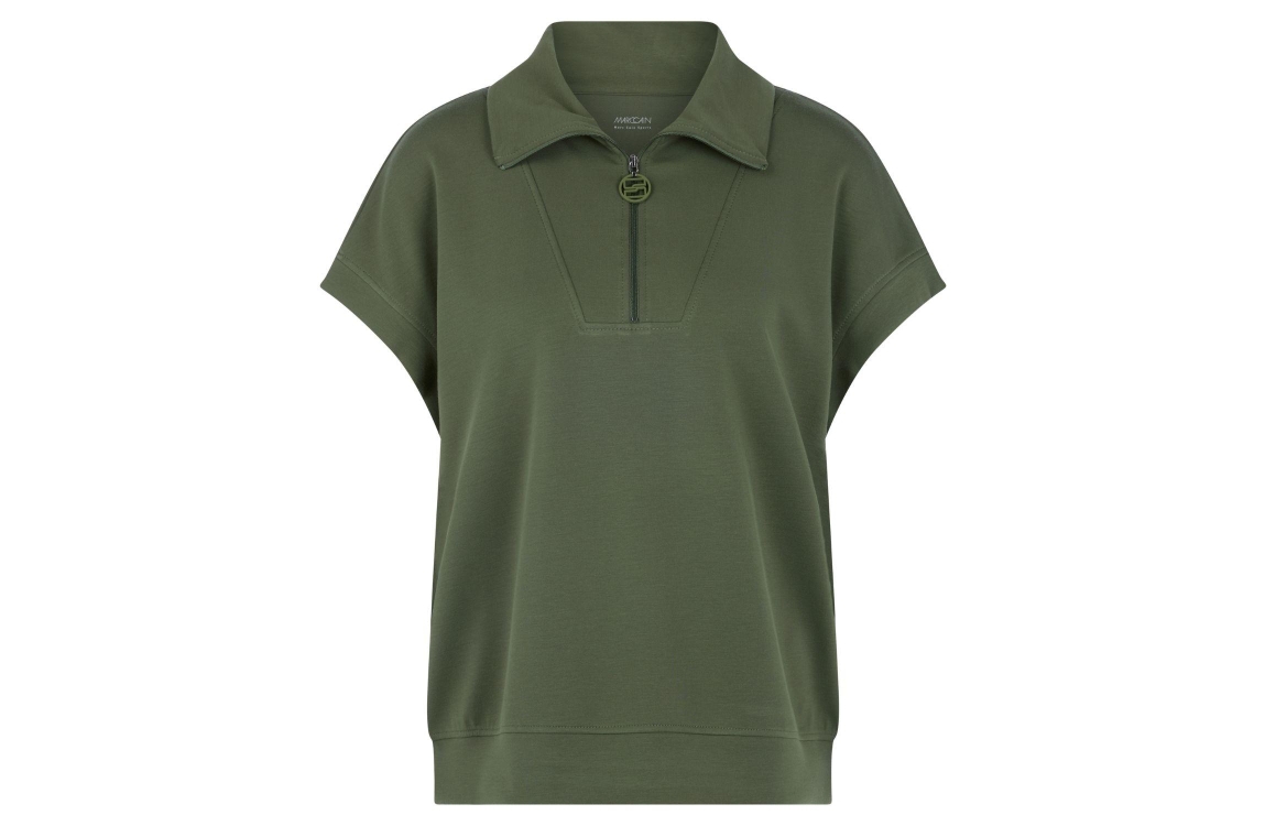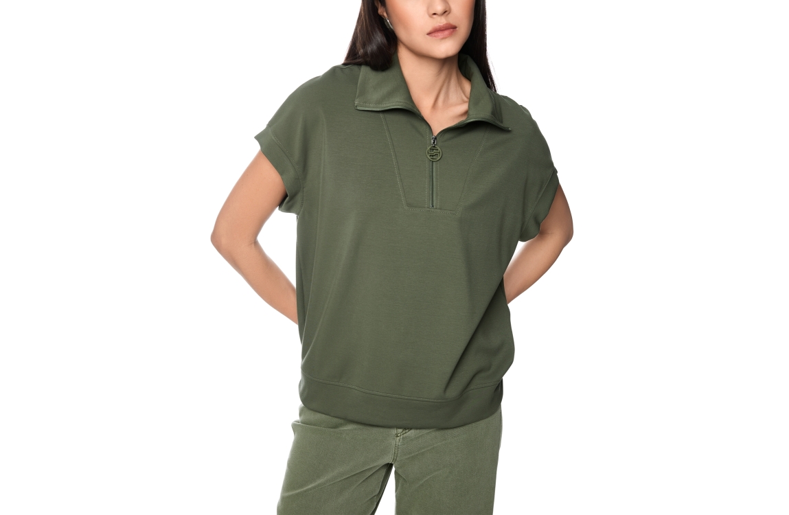 MarcCain Sports T-Shirt 574 Olivine. Dit wijdvallende model heeft een kraag en korte mouwen. Dit groene t-shirt van Marc Cain sluit bij de kraag door middel van een ritssluiting. Dit model is afgewerkt met een brede boord met zijsplitten.