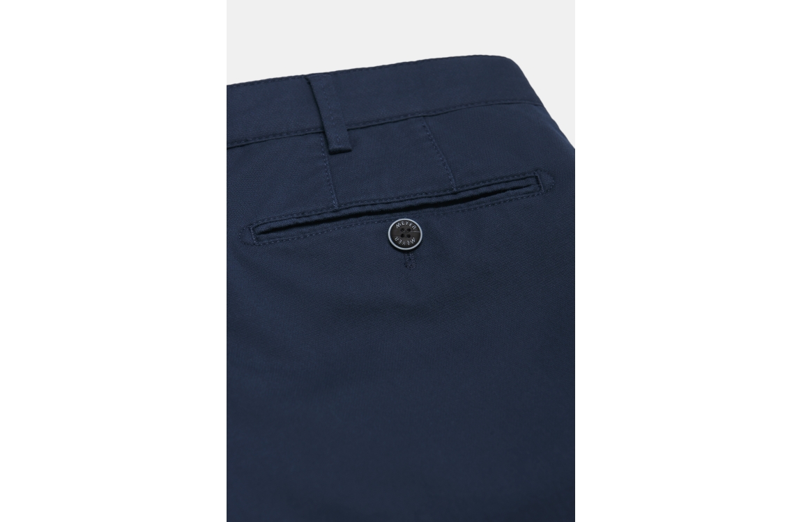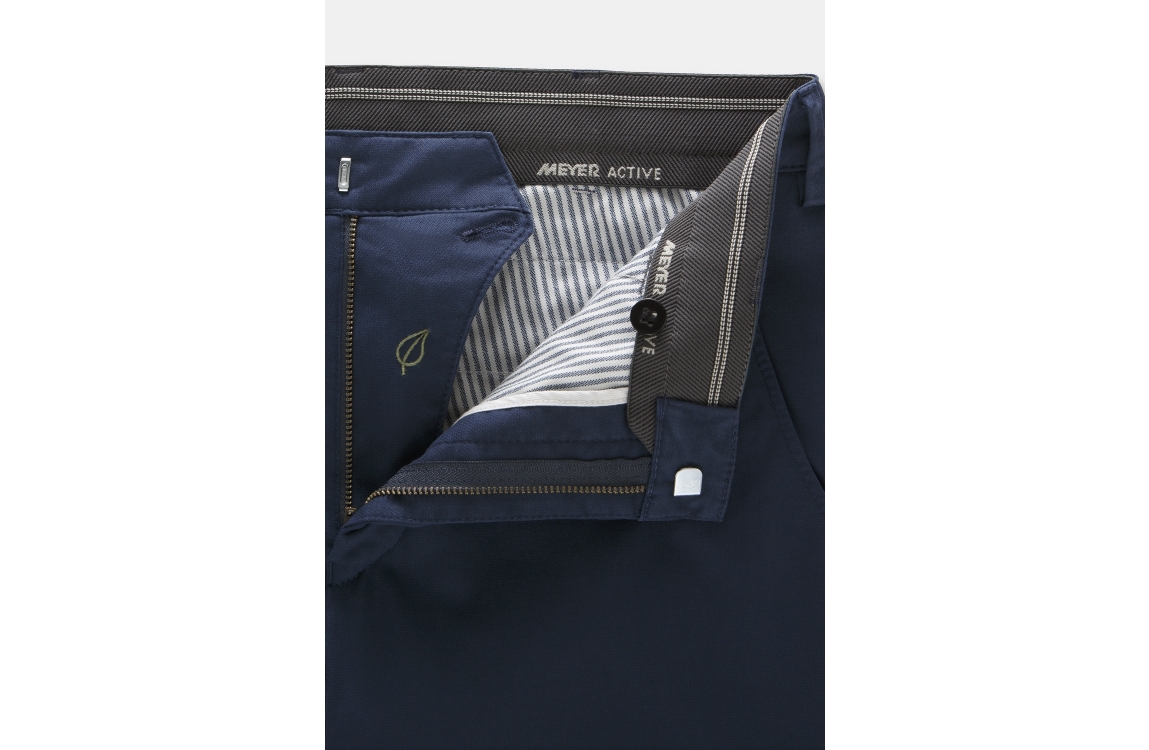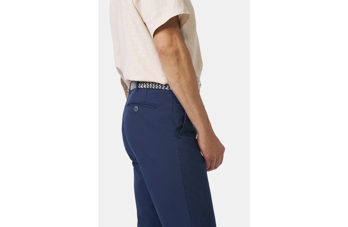 Meyer broek Bonn 1021812100. Dit regular fit model sluit door middel van een knoop met rits, en is voorzien van ceintuurlussen. Deze donkerblauwe broek van Meyer is voorzien van twee steekzakken aan de voorzijde en twee paspelzakken aan de achterzijde.