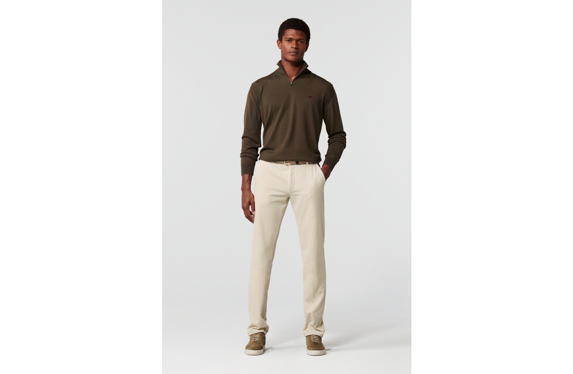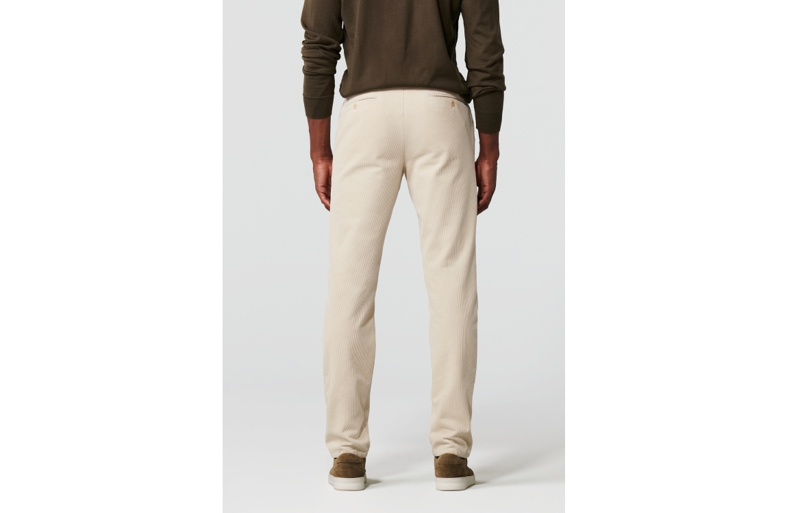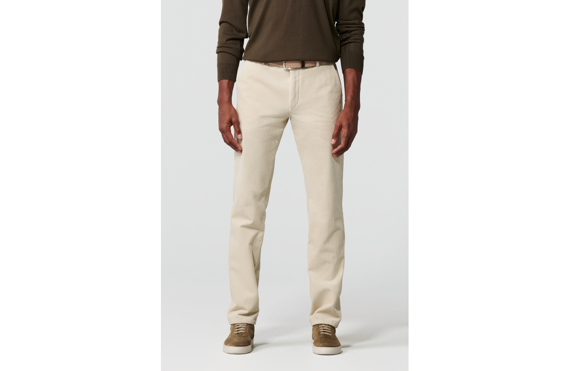 Meyer broek Bonn 1022854900. Dit rechtvallend model is voorzien van ceintuurlussen en heeft twee steek en paspelzakken. Deze beige corduroy broek van Meyer sluit door middel van rits en haakknoop.