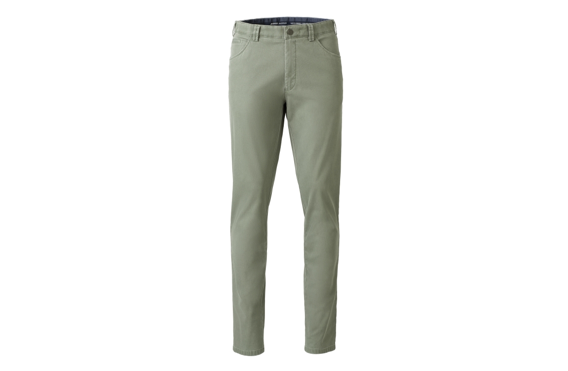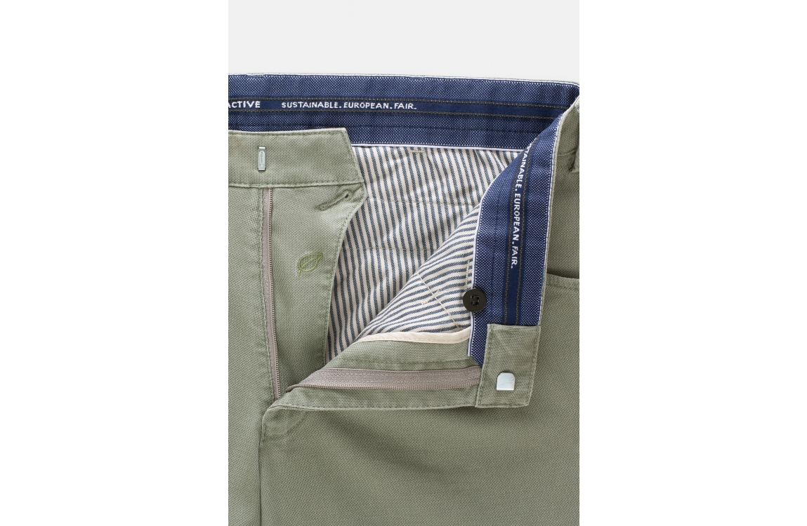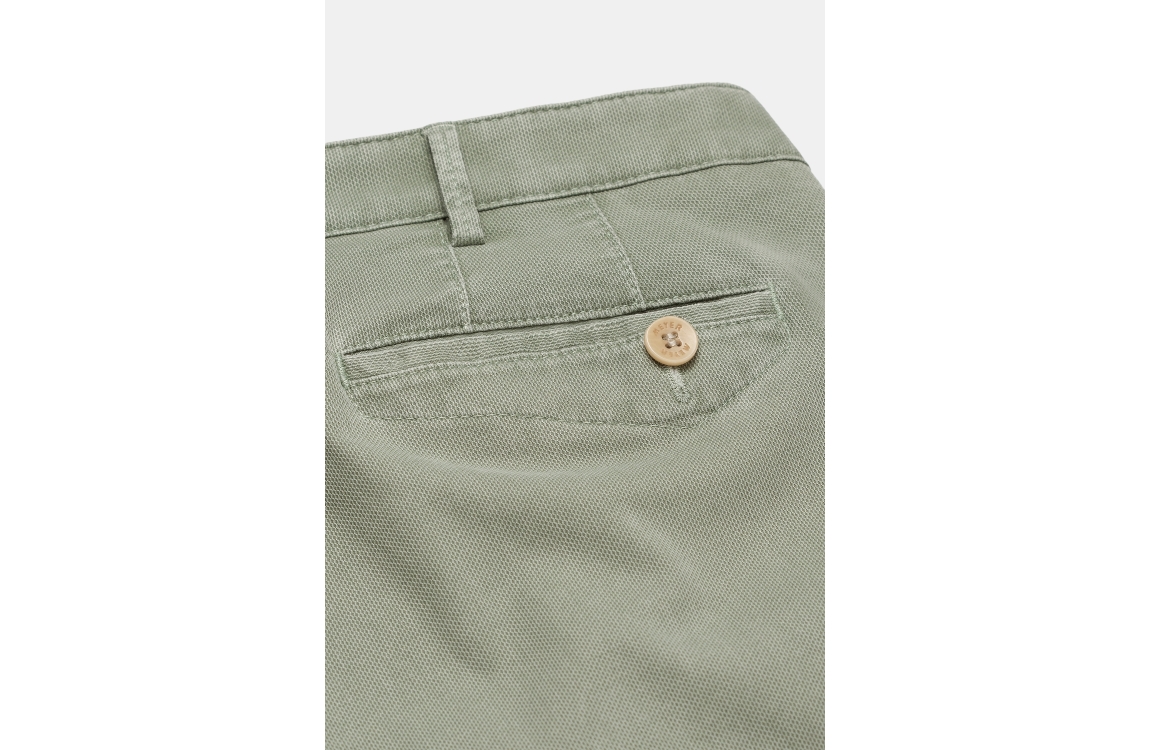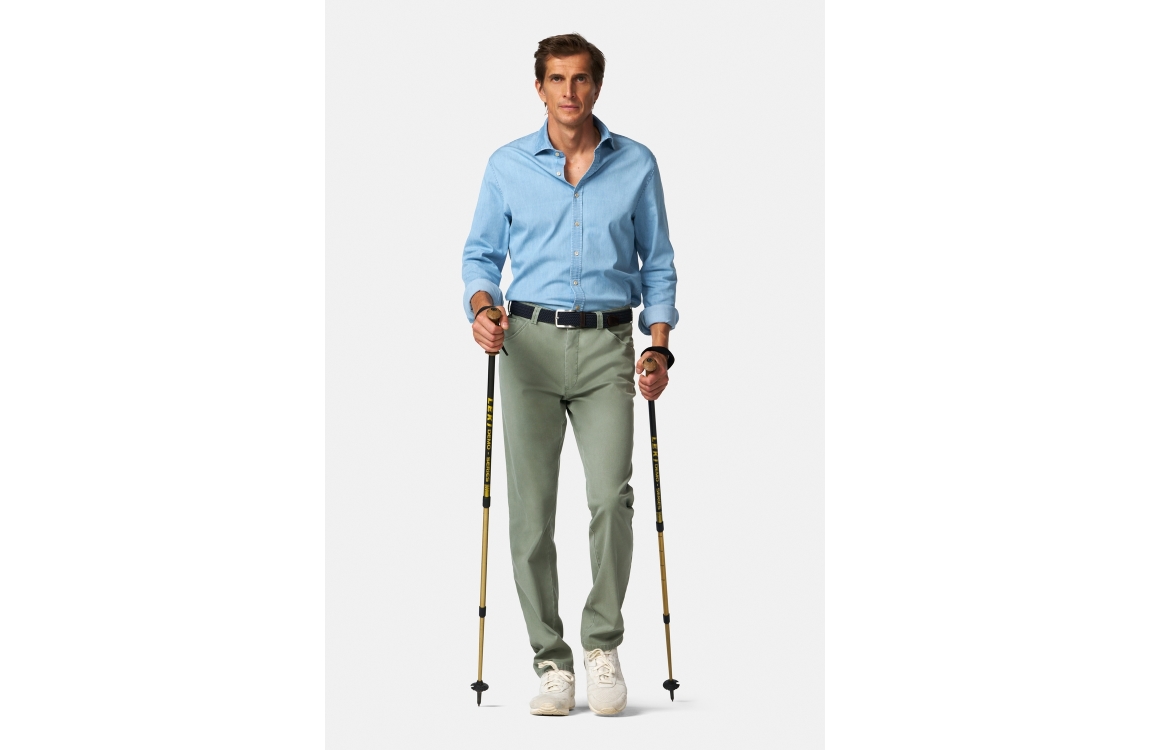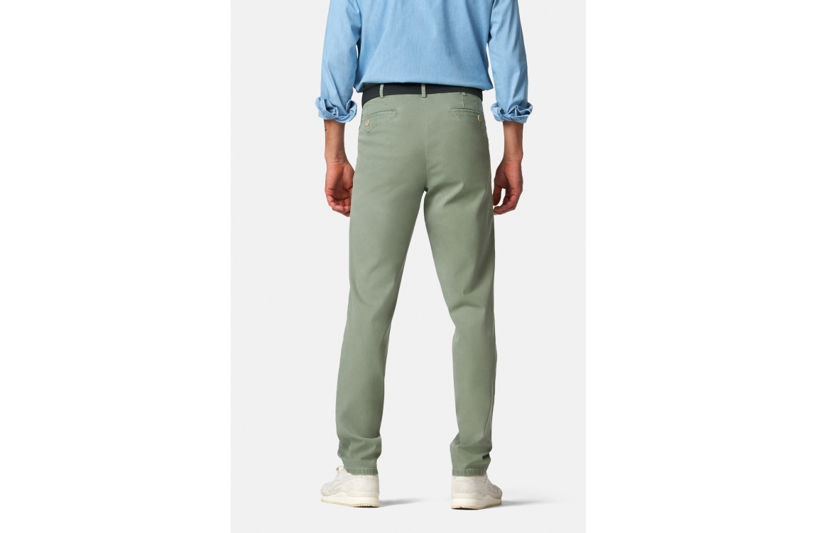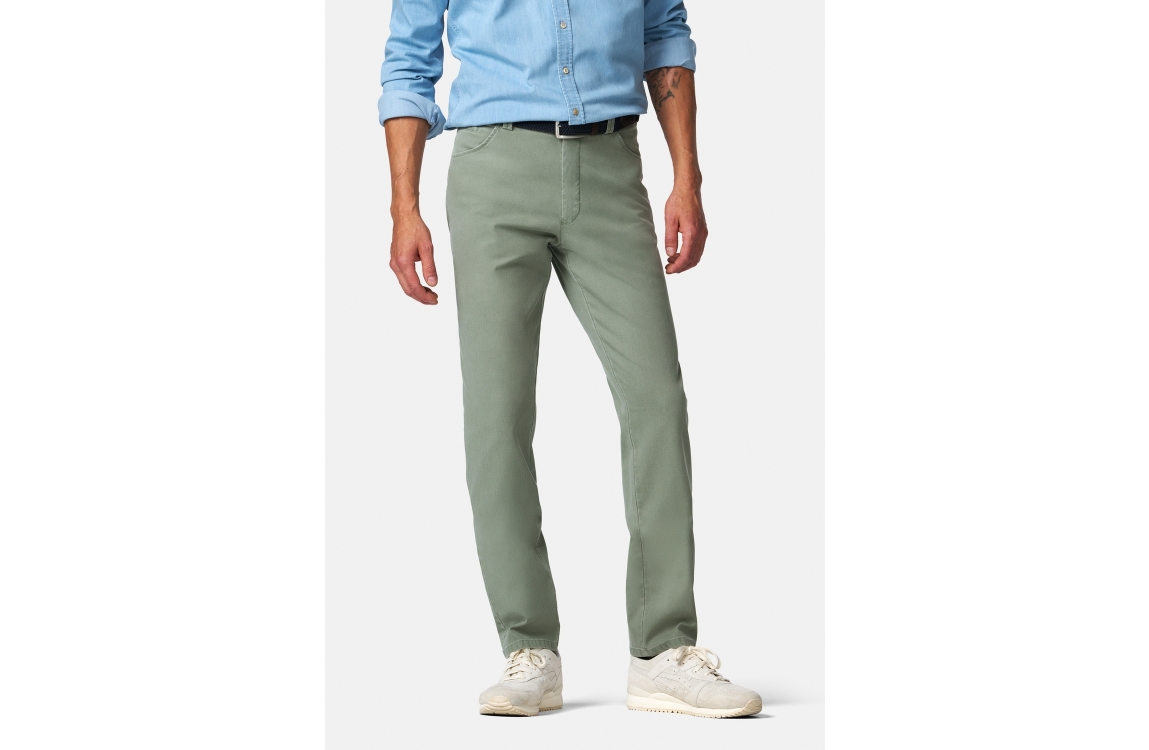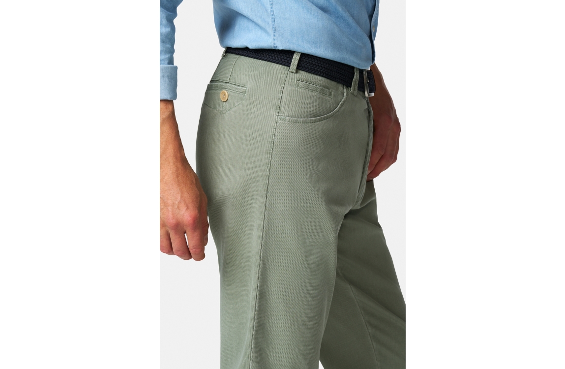 Meyer broek Dublin 1279300900. Dit rechtvallend model is voorzien van ceintuurlussen en heeft twee steekzakken en paspelzakken, deze licht groene broek van Meyer sluit door middel van rits en knoop.