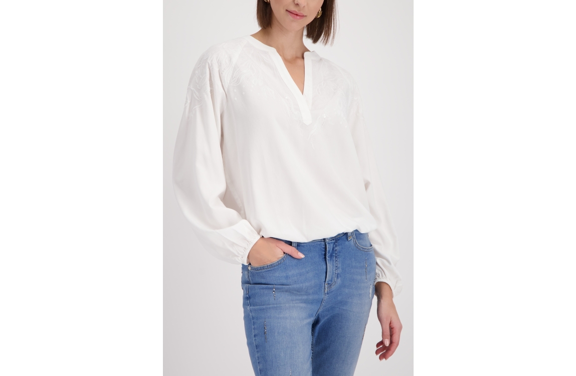Monari Bluse 102 Off white. Dit rechtvallende model is voorzien van een v-hals en heeft lange mouwen. Deze off-white blouse van Monari is afgewerkt met elastische boorden en bewerkt met een borduursel.