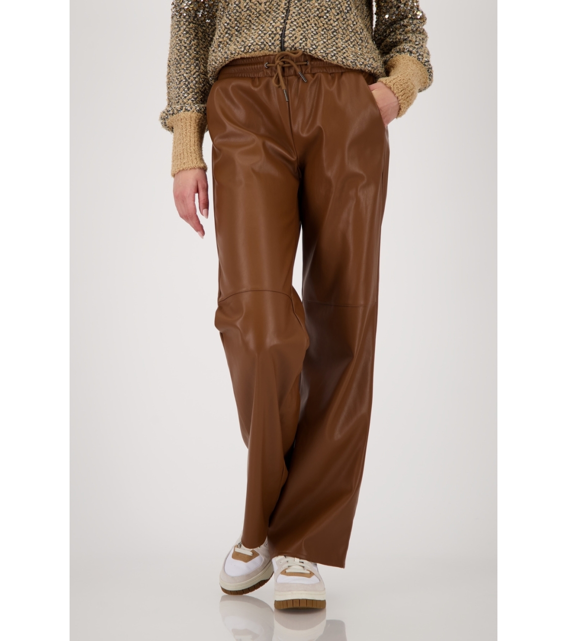 Monari Hose 530 Whiskey. Dit rechtvallende model sluit aan de bovenzijde door middel van een elastische band en een koord. Deze bruine broek van Monari is bewerkt met stiknaaden ter hoogte van de knie. Dit model is voorzien van twee steekzakken.